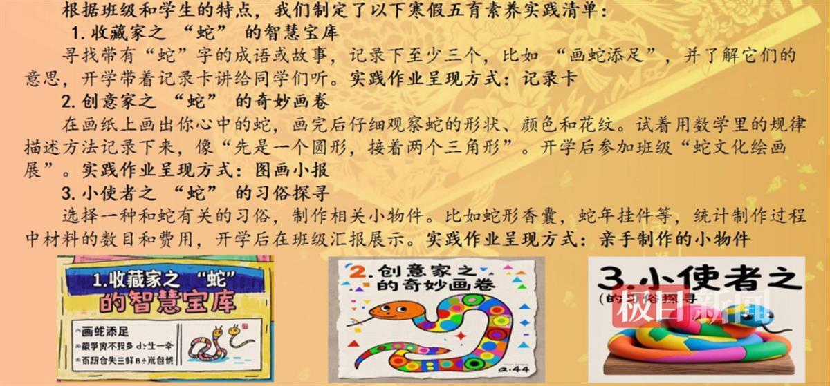 “全区30所小学、1000多个班级参与寒假实践,通过实践活动,减轻学生负担,提升综合素质,让寒假成为学生们成长的新起点。”江汉区教育局小教科负责人表示,在“双减”政策的深入实施下,江汉区教育局积极响应社会期盼,创新性地推出了小学生寒假作业新方案——以五育实践活动取代传统的学科书面假期作业。这项举动结合《武汉市中小学书记校长发展素质教育履职考核评价实施方案》和江汉区“5十N”课程圈实践拟定,力求在五育发展上做加法,作业量上做减法,实践素养上做乘法,身心负担上做除法,让每个江汉学子能量满满地迎接新学期。