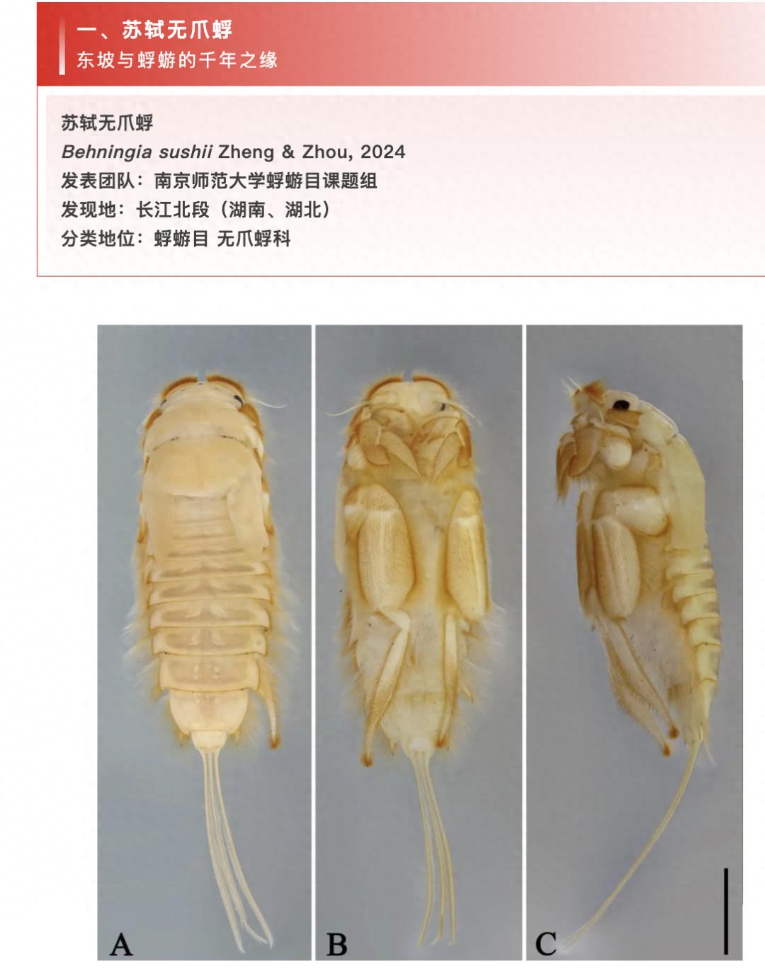 据该文介绍,元丰五年,苏东坡在游览长江北段的赤壁矶后写下了“寄蜉蝣于天地,渺沧海之一粟”的千古绝句。千年之后的2024年,一个蜉蝣新物种于长江北段被发现。为了纪念这场跨越千年的缘分,该物种被命名为“苏轼无爪蜉”。