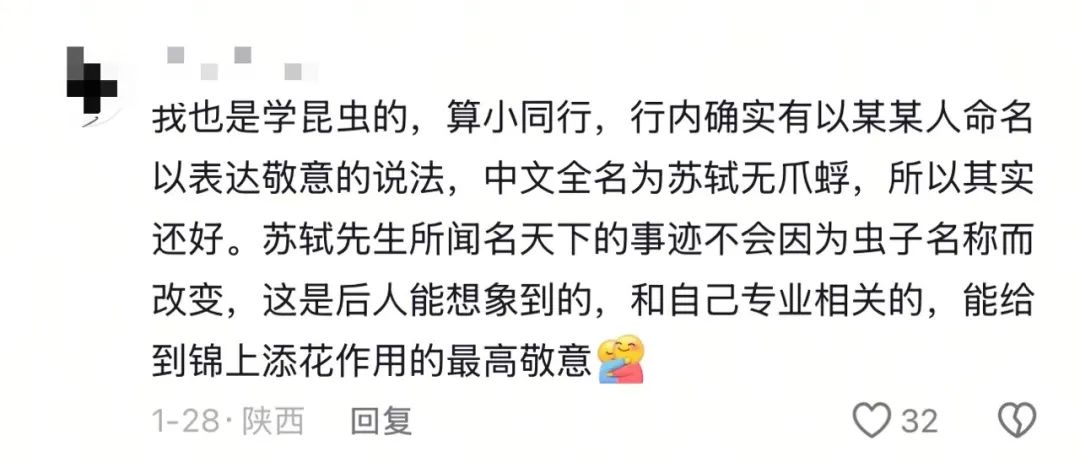 随着“苏轼无爪蜉”的关注度越来越高,网友们开始争论以“苏轼”命名是否合适↓