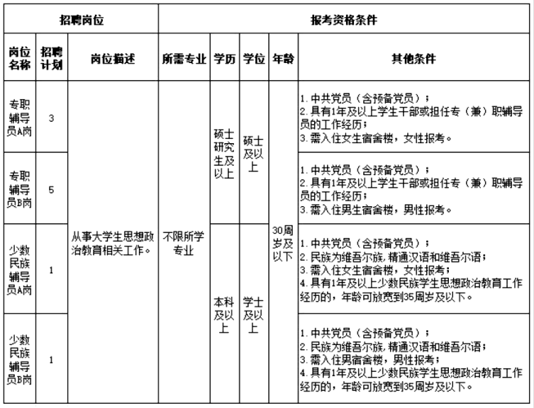 本次拟公开招聘专职辅导员10人。具体岗位及条件详见《湖北师范大学2025年面向社会公开招聘专职辅导员岗位一览表》(详见附件1)。