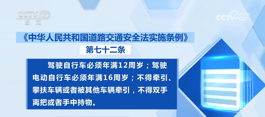 根据《中华人民共和国道路交通安全法实施条例》的相关规定,驾驶自行车必须年满12周岁;驾驶电动自行车必须年满16周岁;不得牵引、攀扶车辆或者被其他车辆牵引,不得双手离把或者手中持物。