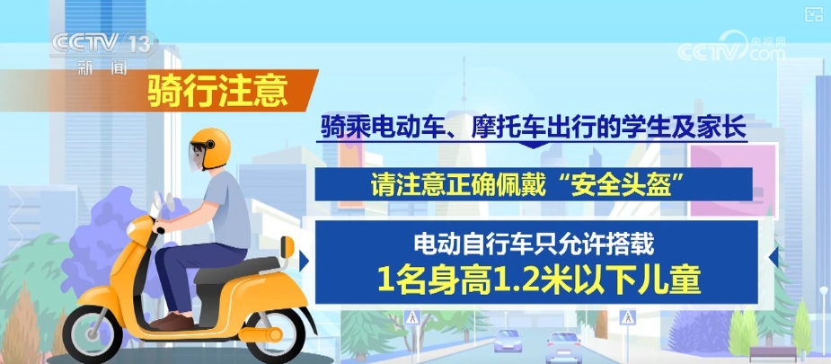 骑乘电动车、摩托车出行的学生及家长,请注意正确佩戴“安全头盔”。电动自行车只允许搭载1名身高1.2米以下儿童,骑车需做到各行其道,不闯红灯、不逆行,远离大型车辆盲区。