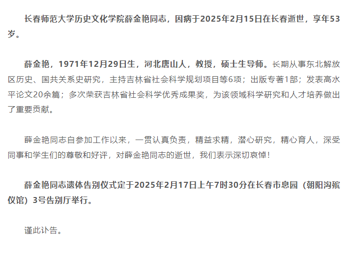 长春师范大学历史文化学院薛金艳同志,因病于2025年2月15日在长春逝世,享年53岁。