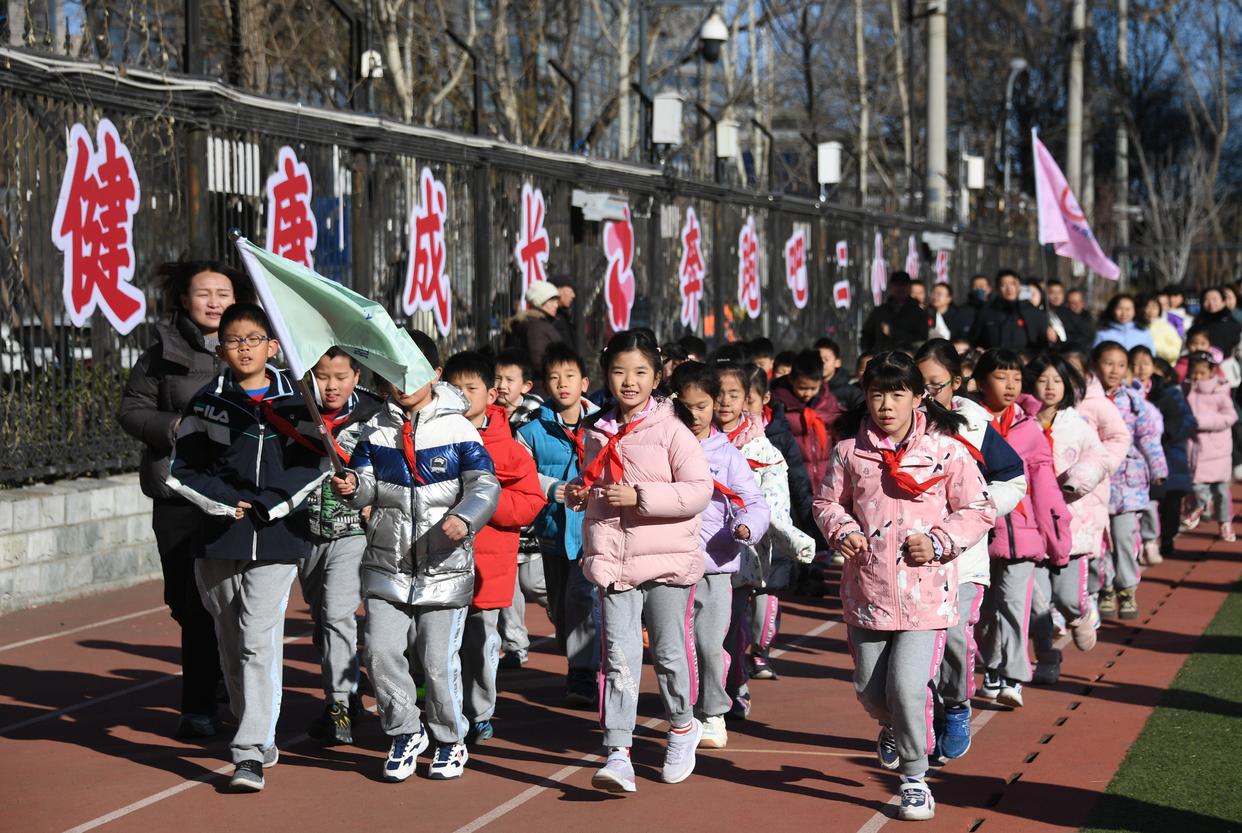 2月17日,重庆市沙坪坝区新桥小学学生正在操场上进行课间活动。新华社记者周思宇 摄 北京市东城区史家胡同小学的礼堂里,国乒奥运冠军马龙和小学生们一起击球、托球跑,现场欢呼声和笑声此起彼伏。