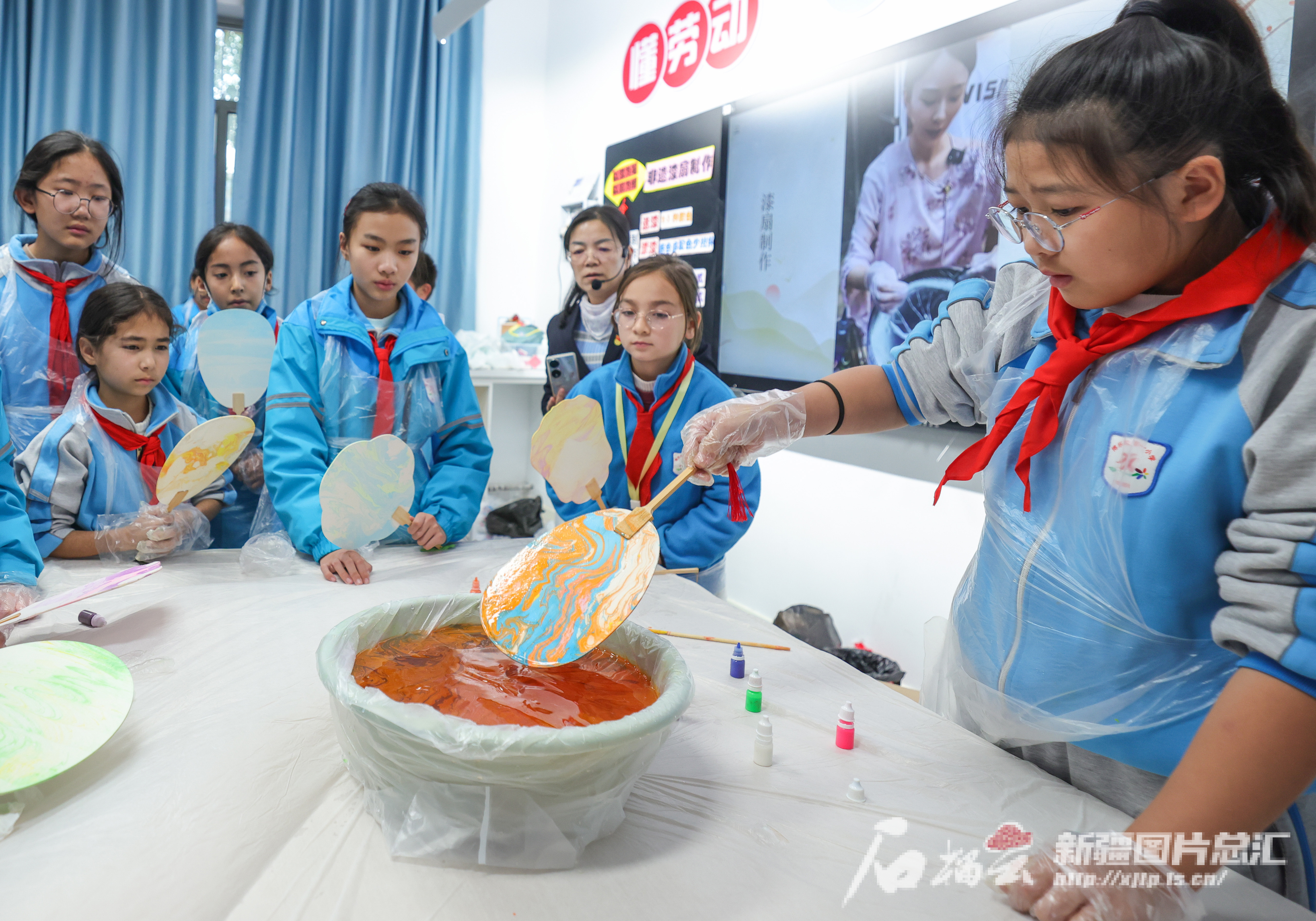 与此同时,在非遗手工社团活动室,学生们正全神贯注地体验传统漆扇工艺的独特魅力。他们轻轻将颜料滴入水中,随后将空白的扇面缓缓浸入水中,经过细致地旋转和擦拭,一把把色彩绚丽、充满艺术韵味的漆扇便呈现在眼前。