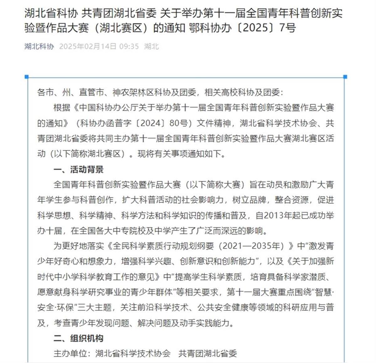 2月19日,据湖北省科协消息,由湖北省科协、共青团湖北省委联合主办的第十一届全国青年科普创新实验暨作品大赛湖北赛区活动(以下简称湖北赛区)即日启动,湖北赛区各项目各组别参赛队伍须于2025年4月11日前登录全国大赛官方网站(https://kepudasai.cdstm.cn/#/)报名,并按初赛规则要求提交作品材料。