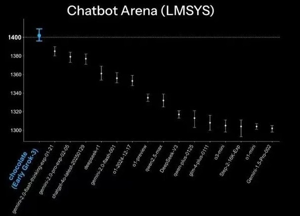 在大模型竞技场ChatbotArenaLLM排行榜上,代号巧克力的Grok3早期版本登上榜一,成为有史以来第一个突破1400分的模型,各大模型无出其右。不过这一分数也只比DeepSeekR1高2.9%。PPT上柱状图之所以高低相差显著,是因为图片是从1300开始截图,等于自带“放大”效果。