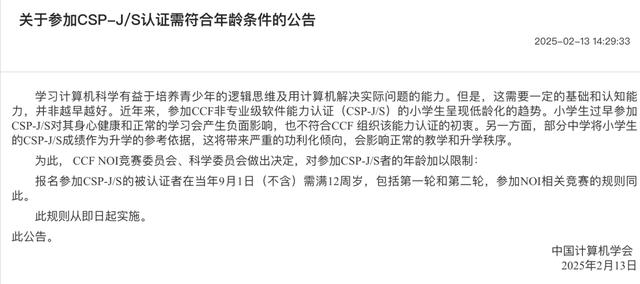 这两天,各大网络平台上出现了很多以类似字眼儿为标题的、被家长们称作是“核弹级”的消息。原来,近日,中国计算机学会宣布对其主办的CSP-J/S认证(中国计算机学会认证服务提供者-软件能力认证)作出年龄限定,要求报名者在当年9月1日(不含)需满12周岁,包括第一轮和第二轮,参加“全国青少年信息学奥林匹克竞赛(NOI)”的规则同此,即日起实施。这意味着相关认证和赛事明确将小学生群体拒之门外了。
