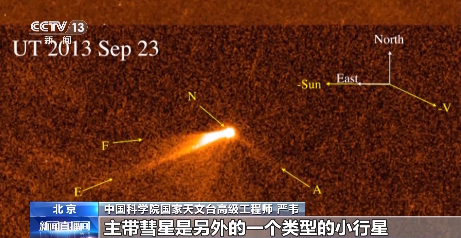 中国科学院国家天文台高级工程师严韦:主带彗星是另外的一个类型的小行星,它不是彗星,但是它又有彗星的一些特征,所以把它叫作主带彗星,或者是活跃小行星。它可能会在距离太阳比较近的时候,喷发出一些物质,包括气体、一些颗粒,这也是被观测到的,也是另外的一个研究热点。