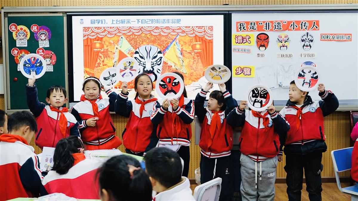“蓝脸的窦尔敦盗御马,红脸的关公战长沙……”2月20日下午,在《说唱脸谱》的动感旋律中,武汉市黄陂区天河航天小学三(4)班的教室瞬间变身“京剧工坊”。这堂综合实践课,让京剧脸谱“跳”进了孩子们的画笔。
