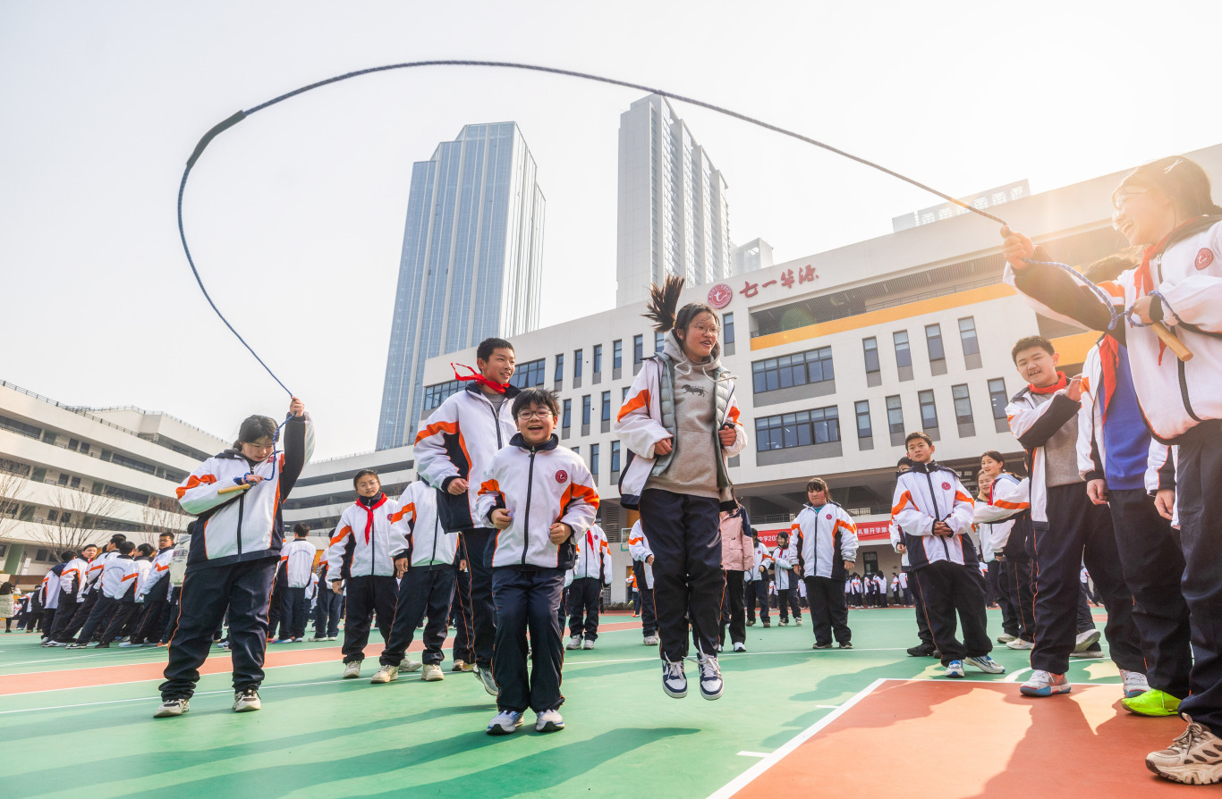 武汉市七一华源中学滨江校区学生在大课间开展跳长绳活动(湖北日报记者薛婷摄)