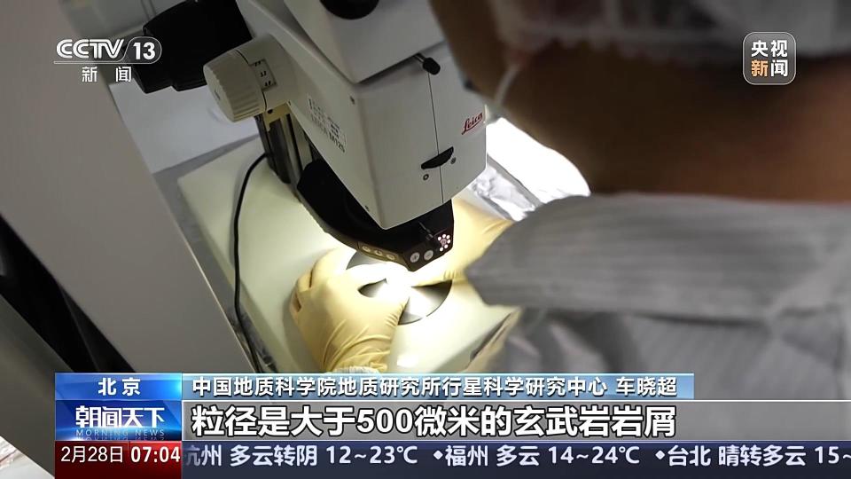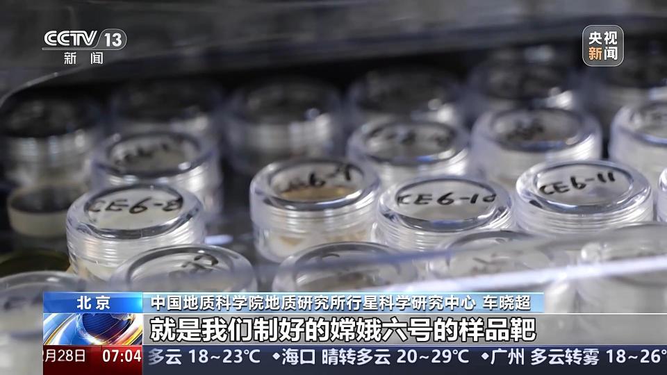 中国地质科学院地质研究所行星科学研究中心 车晓超:这个实验室是我们用于月球样品保存的实验室,手套箱里面是充着高纯的氮气,来保证月壤的干燥,远离氧气。嫦娥六号月壤粒径很小,我们第一份工作是从这两克的嫦娥六号月壤里面挑出了33颗,粒径是大于500微米的玄武岩岩屑,制成一个可以放到测试仪器里面的标准的一个靶里面。
