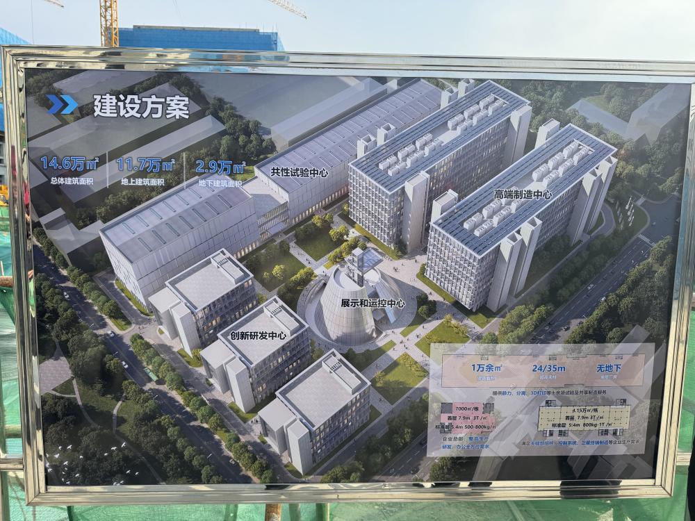 如果说酷炫展厅是吸引公众的打卡地,那两侧的建筑群则是“含金量”十足的产业集聚区,分别建设有共性技术平台、高端制造中心和创新研发中心,目前多座楼体已经封顶。