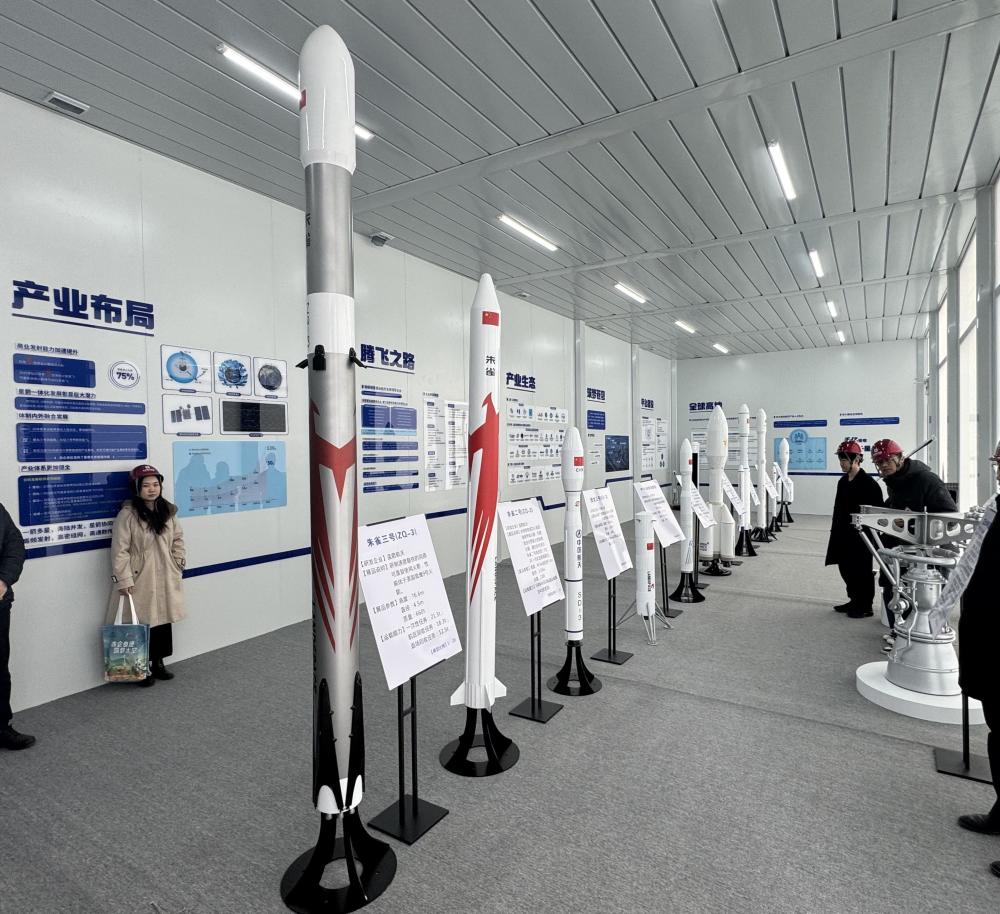 步入建设现场临时展厅,10余个等比例火箭模型几乎挤满整个屋子。“这是中国版可重复使用火箭——朱雀三号,这是采用一箭十星在海上发射的捷龙三号……”赵延标介绍。
