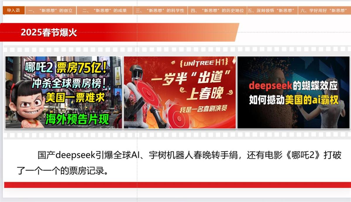 近日,新学期的第一节思政课,武汉城市学院马克思主义学院的老师们不讲大道理,而是将近期刷屏的热搜事件——中国AI公司DeepSeek搅动美股风云、《哪吒2》的赛博朋克龙宫、春晚机器人秧歌表演等时政热点巧妙融入课堂,为同学们呈现了一堂堂“接地气”的思政课,牢牢抓住了同学们的注意力。