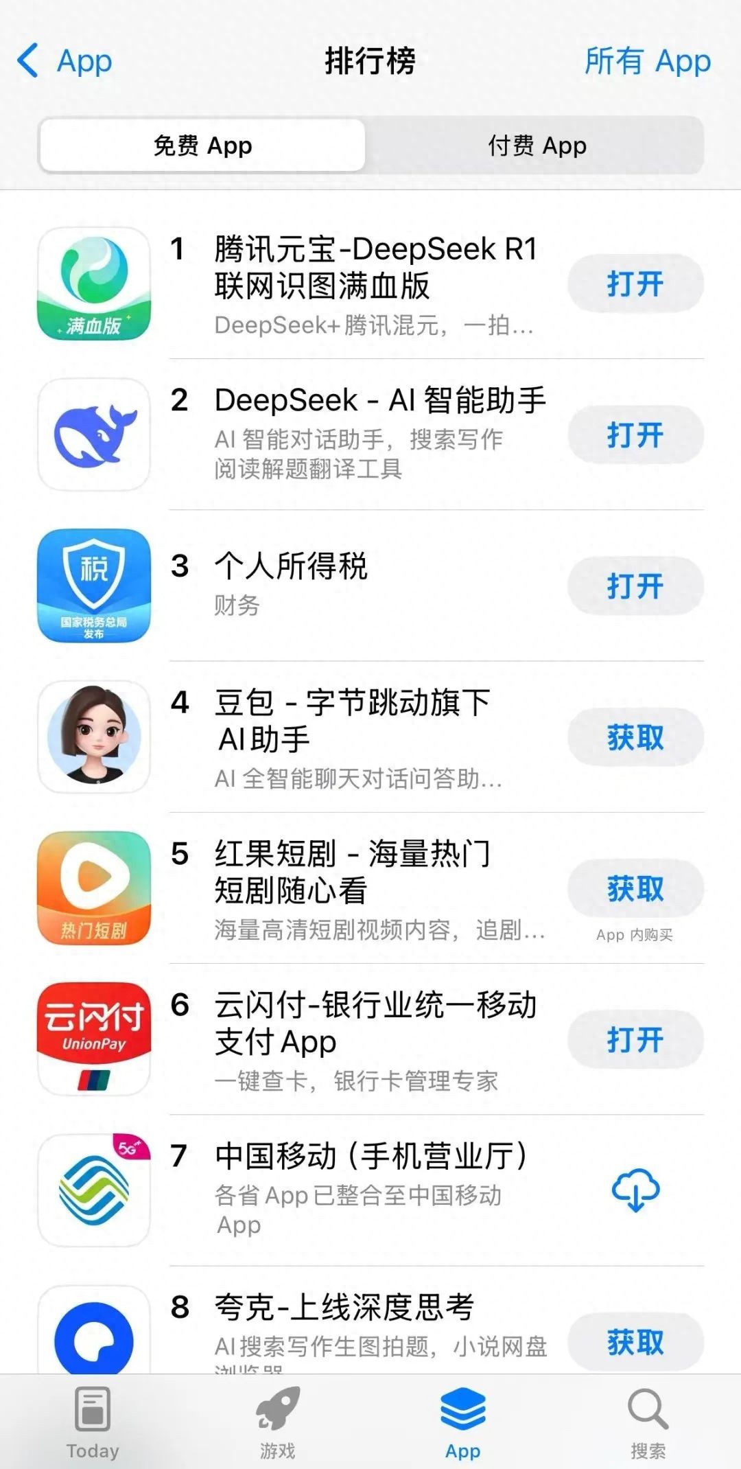 近期,腾讯元宝是AIGC应用中用户增长最快的App。2月22日,腾讯元宝在中国区苹果应用商店免费App下载排行榜上猛地上升了100多名,排名超越豆包,仅次于DeepSeek。从第二位升至第一位,腾讯元宝也只用了10天左右。