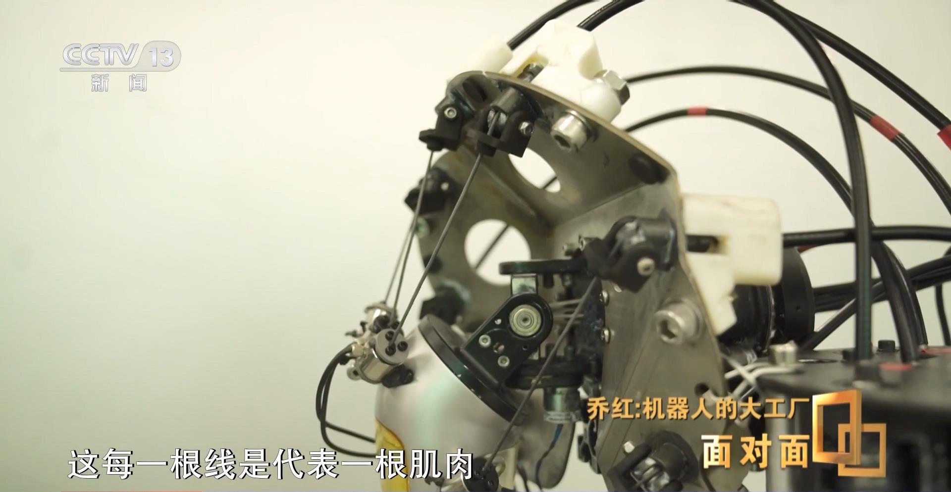 乔红:现在是十几根,这每一根线代表一根肌肉,这些线是把电机的力按人的肌肉排布做的。需要你的这根肌肉,它就模拟这根肌肉。模拟肌肉之后,它远远多过六自由度,这样的话,它的作用就多了,比如它做一件事,可以这样做,也可以这样做,它可以很柔性,这样的话,它躲人会很方便。这个结构不会像电机一样使劲撞人,是小电机带的驱动,而且电机在身上不会跟人在一块,人机交互更轻松一些。