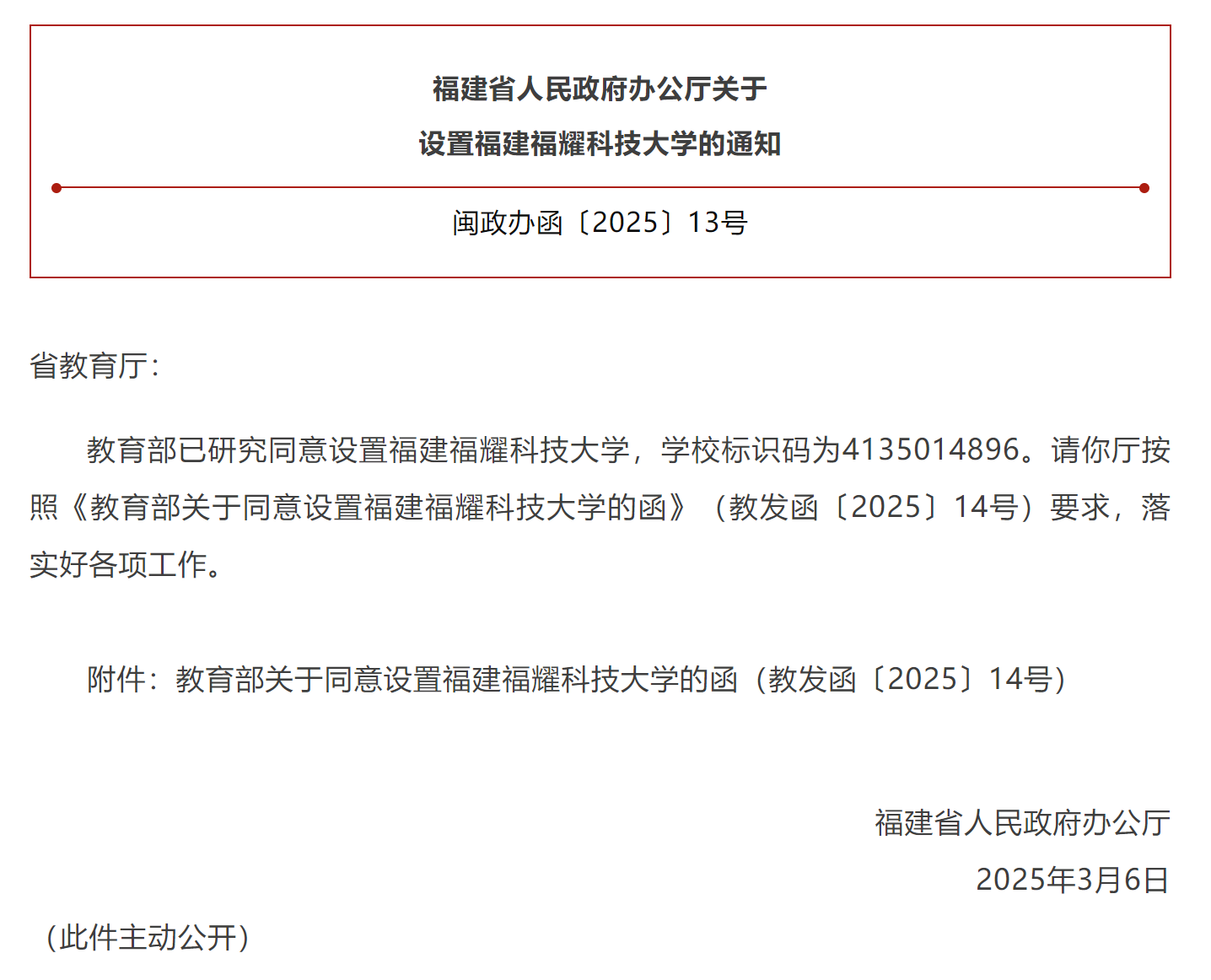 大皖新闻讯3月11日,福建省人民政府办公厅微信公众号“中国福建”公布了《福建省人民政府办公厅关于设置福建福耀科技大学的通知》,该《通知》由福建省人民政府办公厅发给福建省教育厅,落款时间为2025年3月6日。《通知》中介绍:“教育部已研究同意设置福建福耀科技大学,学校标识码为4135014896。”