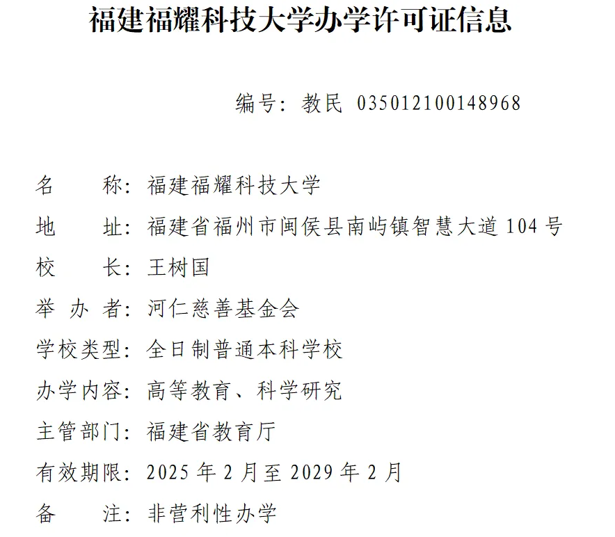 《教育部关于同意设置福建福耀科技大学的函(教发函〔2025〕14号)》文件显示,福建福耀科技大学为民办普通本科学校,定位为新型研究型大学,紧紧围绕国家战略和经济社会发展需要,突出理工和科技,着重开展制造业科技创新研究,培养拔尖创新人才;学校专业设置按教育部有关规定办理,同意首批设置计算机科学与技术、智能制造工程、车辆工程、材料科学与工程等4个普通本科专业;学校全日制在校生规模暂定为8000人。