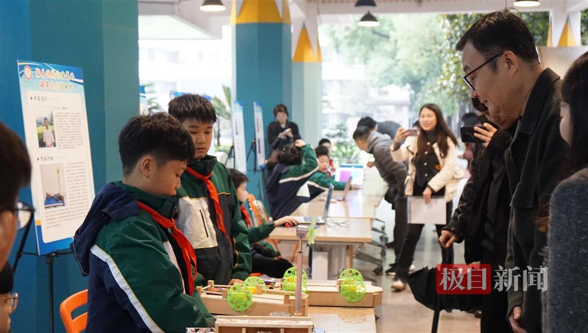 在活动现场,学校一楼大厅展示了学生自主创作的科幻画、创客作品及人工智能编程作品,从充满想象力的未来城市设计到可交互的智能编程,学生们的生动讲解让展区互动氛围热烈。