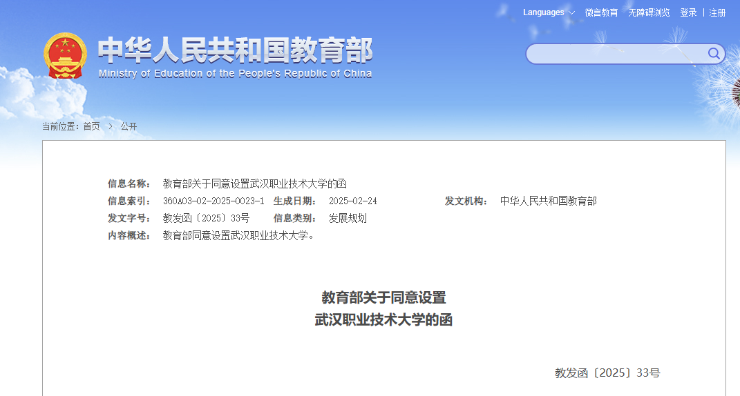 3月17日,教育部官网发布了“教育部关于同意设置武汉职业技术大学的函”,同意设置武汉职业技术大学。