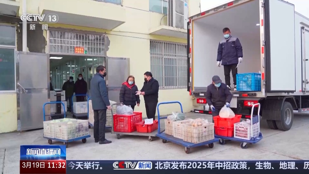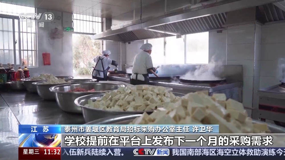 在江苏省校园餐标准化示范点通过引进新技术,实现招标采购不见面,食材加工全监控。清晨五点,江苏泰州姜堰区一家负责配送“校园餐”食材的企业内,灯火通明。出库、搬运、清点,新鲜的蔬菜、肉类将在一个半小时后,送往一所乡村小学。车内,有反映温度的显示器,还有跟踪车辆轨迹的定位系统。
