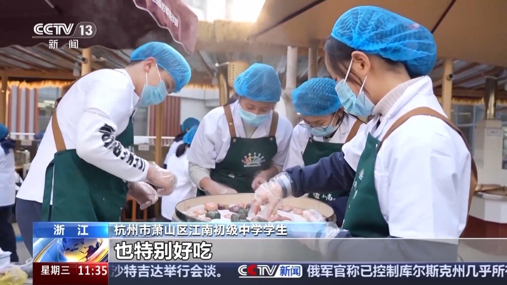 除了现场分享,制作完的青团还会被送到食堂,提供给就餐的师生们一起享用。去年,学校面向学生发放菜单预定表,将以往一荤两素的固定餐制,改为午餐、晚餐的“自助选餐”模式,两个荤菜,五个素菜,每餐14个菜品,为学生提供了“不仅吃饱更要吃好”的供餐服务。