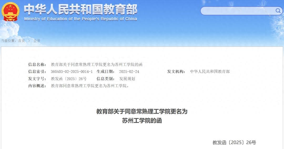《江苏省人民政府关于商请同意常熟理工学院更名为苏州工学院的函》(苏政函〔2023〕104号)收悉。根据《中华人民共和国高等教育法》《普通高等学校设置暂行条例》有关规定以及第八届全国高等学校设置评议委员会评议结果,经教育部党组会议研究决定,同意常熟理工学院更名为苏州工学院,学校标识码为4132010333;同时撤销常熟理工学院的建制。现将有关事项函告如下。