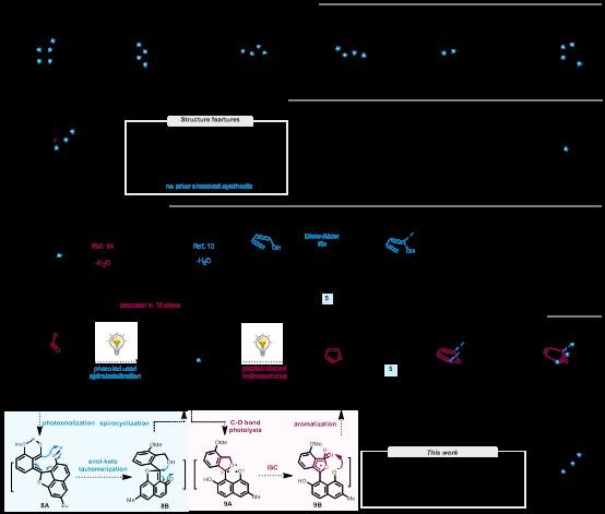 Lugdunomycin分子是一种对革兰氏阳性菌Bacillus subtilis168具有选择性抗菌活性的天然产物,具有独特的[6-6-5-6-6-5-5]七环骨架和苯并氮杂[4,3,3]螺桨烷结构,并且含有三个连续的季碳中心,这使得其全合成极具挑战性。该研究创新性包括:(1)发展光照诱导1,5-HAT/酮-烯醇异构化/螺缩酮化新方法,解决天然产物actinaphthoran B至elmonin的高效转化。机理实验验证表明,酮-烯醇异构化过程中的1,7-H shift过程既可以通过分子内酚羟基,也可以通过分子间水中的质子。(2)发展光照诱导C-O键均裂/系间窜越/1,7-质子转移-芳构化/异苯并呋喃Diels-Alder反应新策略,解决天然产物lugdunomycin连续3个季碳立体中心和苯并[4,3,3]螺桨烷的构建。该研究工作通过13步转化,完成了lugdunomycin的全合成研究。
