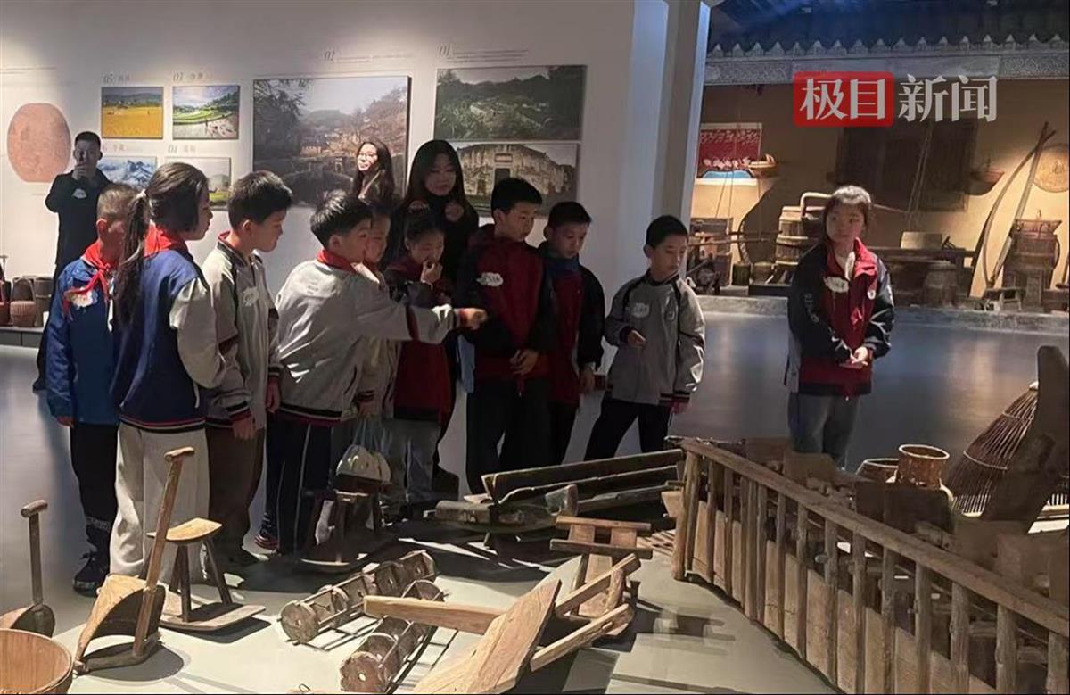 “农耕文化是中华文明的根基,每一件农具都承载着先民与自然共生的智慧。”博物馆讲解员杨梦珂通过实物展品,向学生们展示了从原始石犁到近代铁锄的演变历程。当看到按比例复原的传统厨房时,学生们纷纷惊叹于茅草屋顶和夯土墙的工艺细节。“这种‘土灶台’不仅能做饭,冬天还能取暖!”五年级学生余承浩指着厨房区域说。