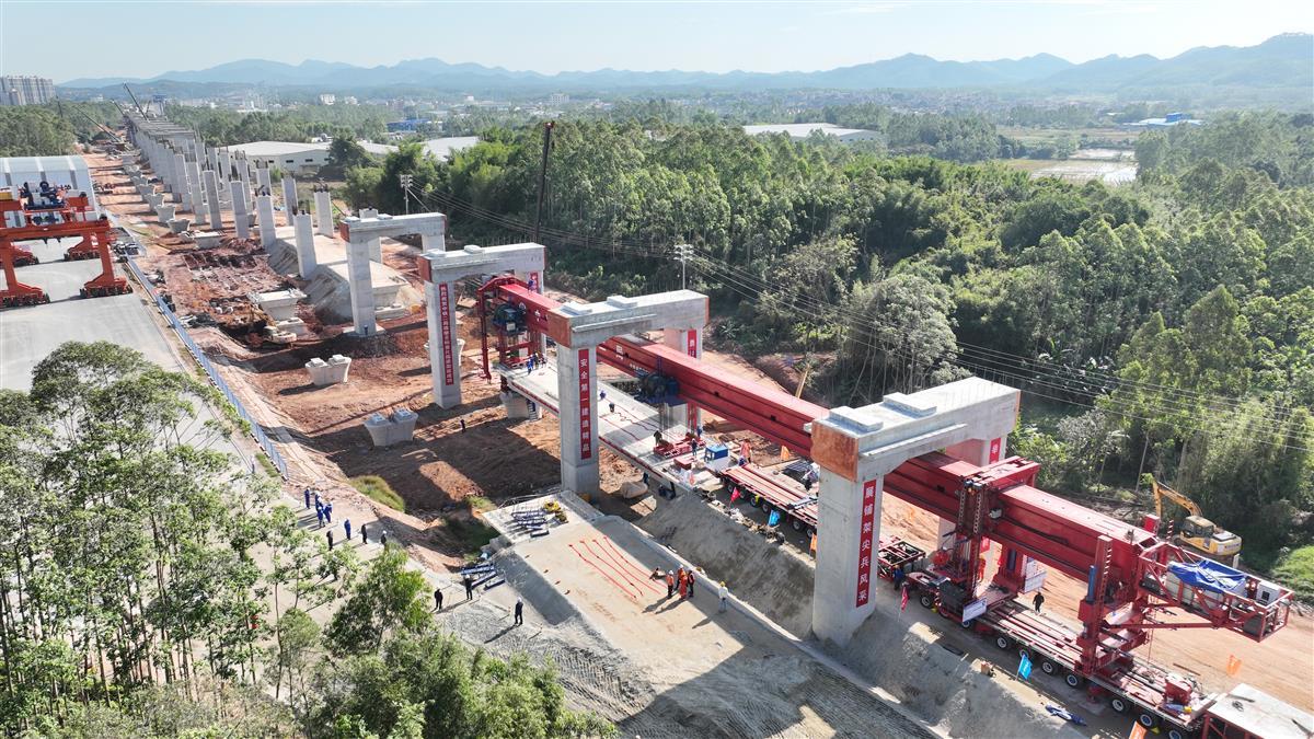 千吨级高铁箱梁多模式新能源架桥机(以下简称:新能源架桥机)是专为满足珠肇高铁特殊、复杂的极限工况建设需求而研制的,能在极限条件下架设460多吨重的单线箱梁,也能在常规条件下架设千吨级的双线箱梁。