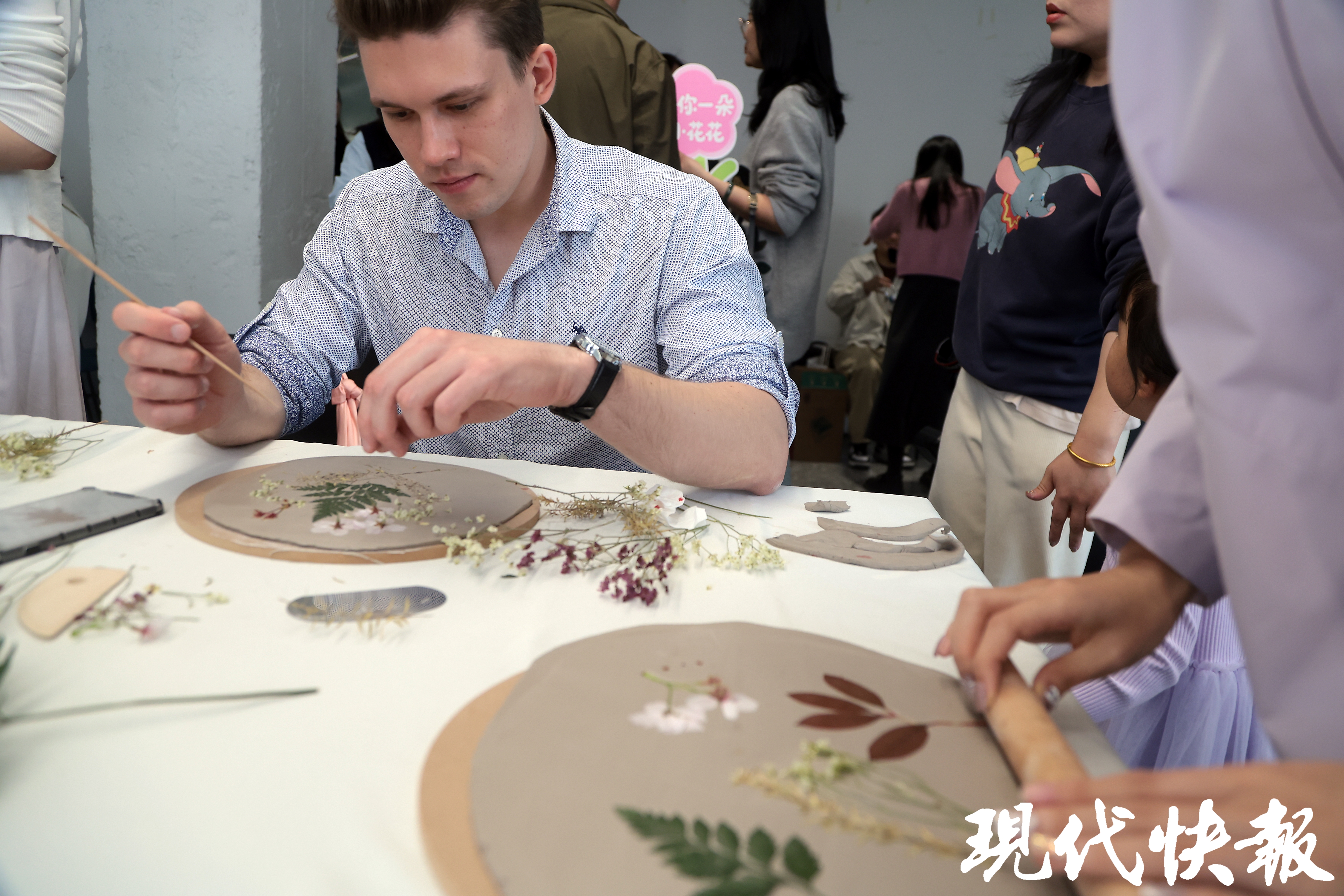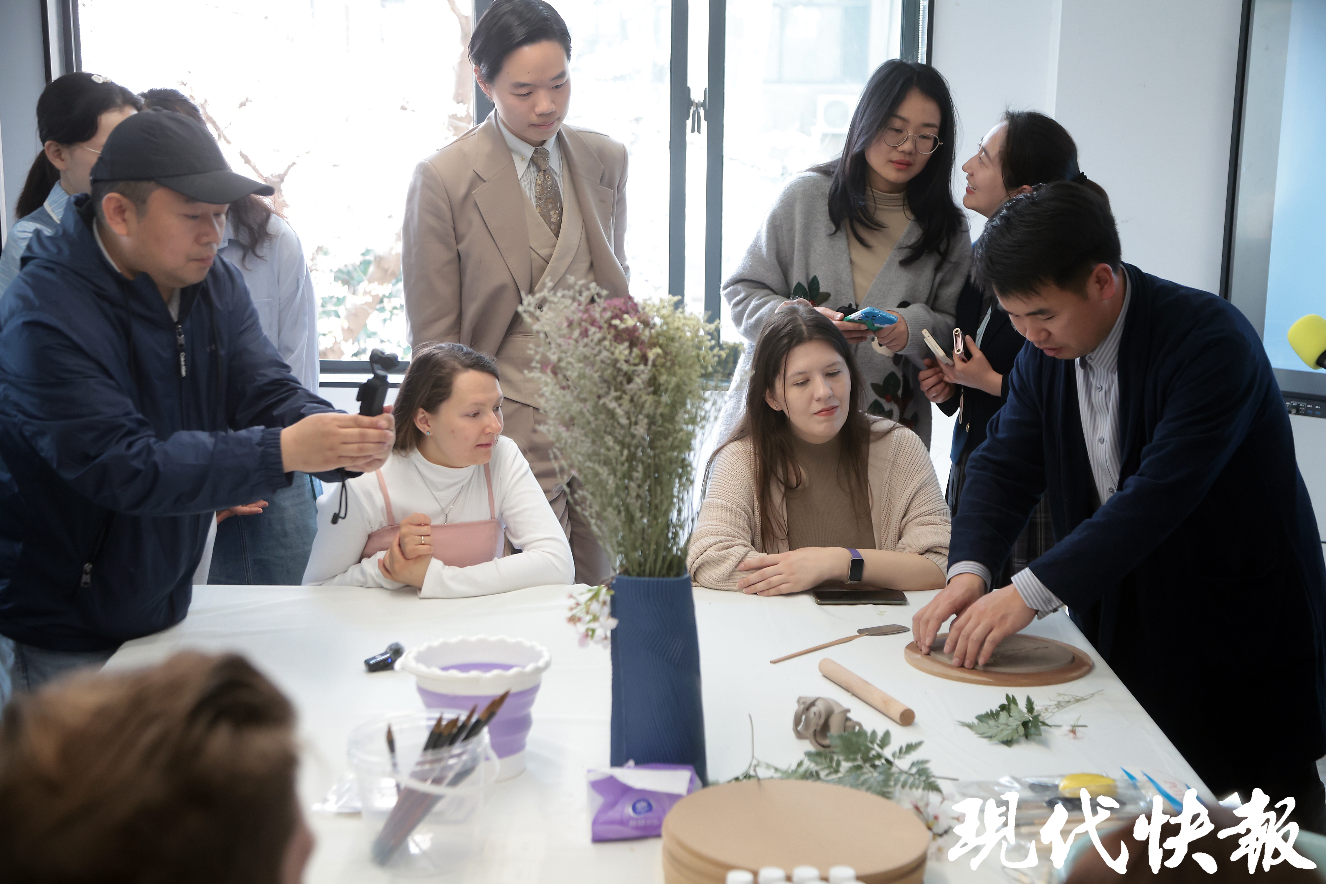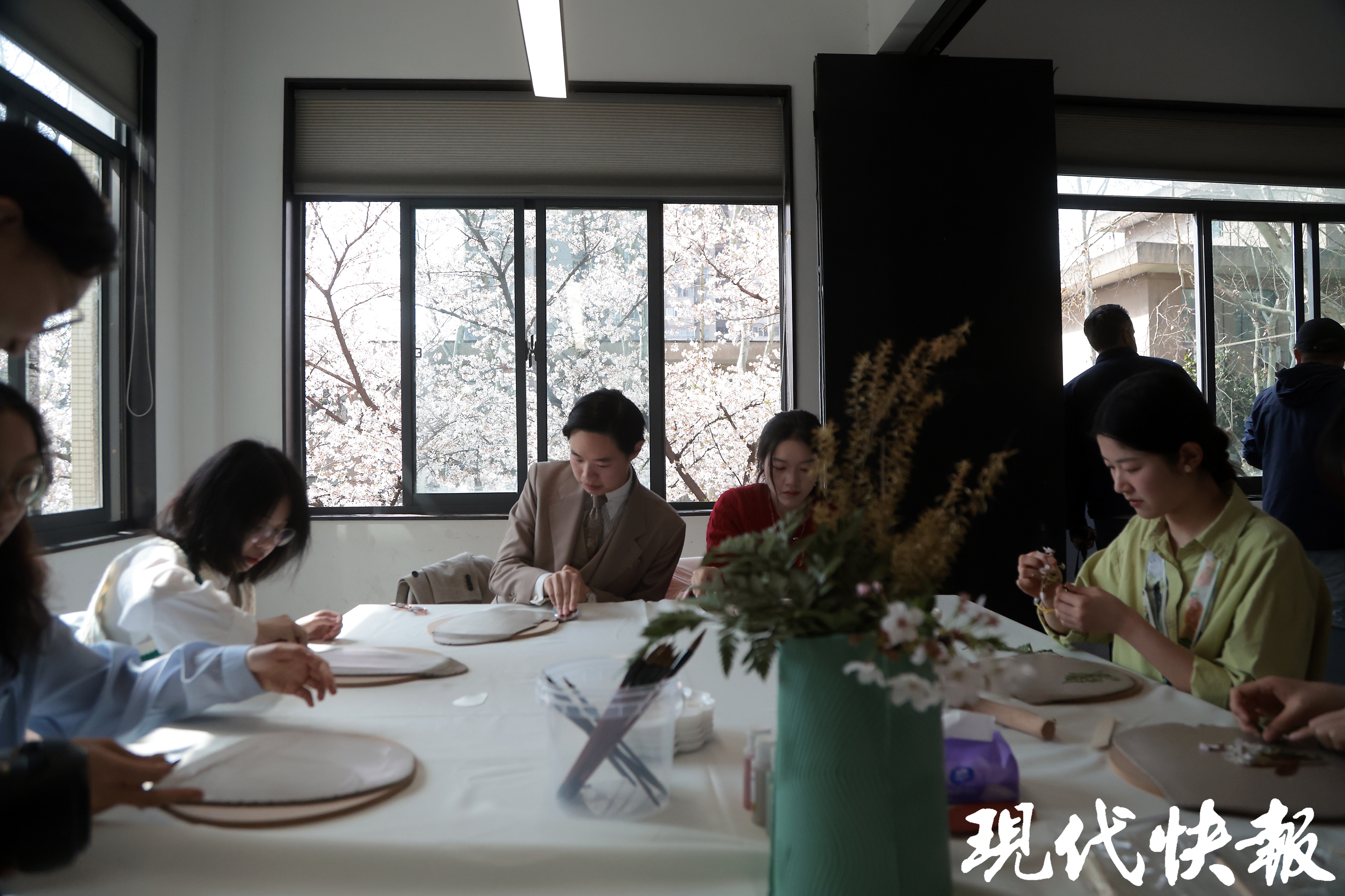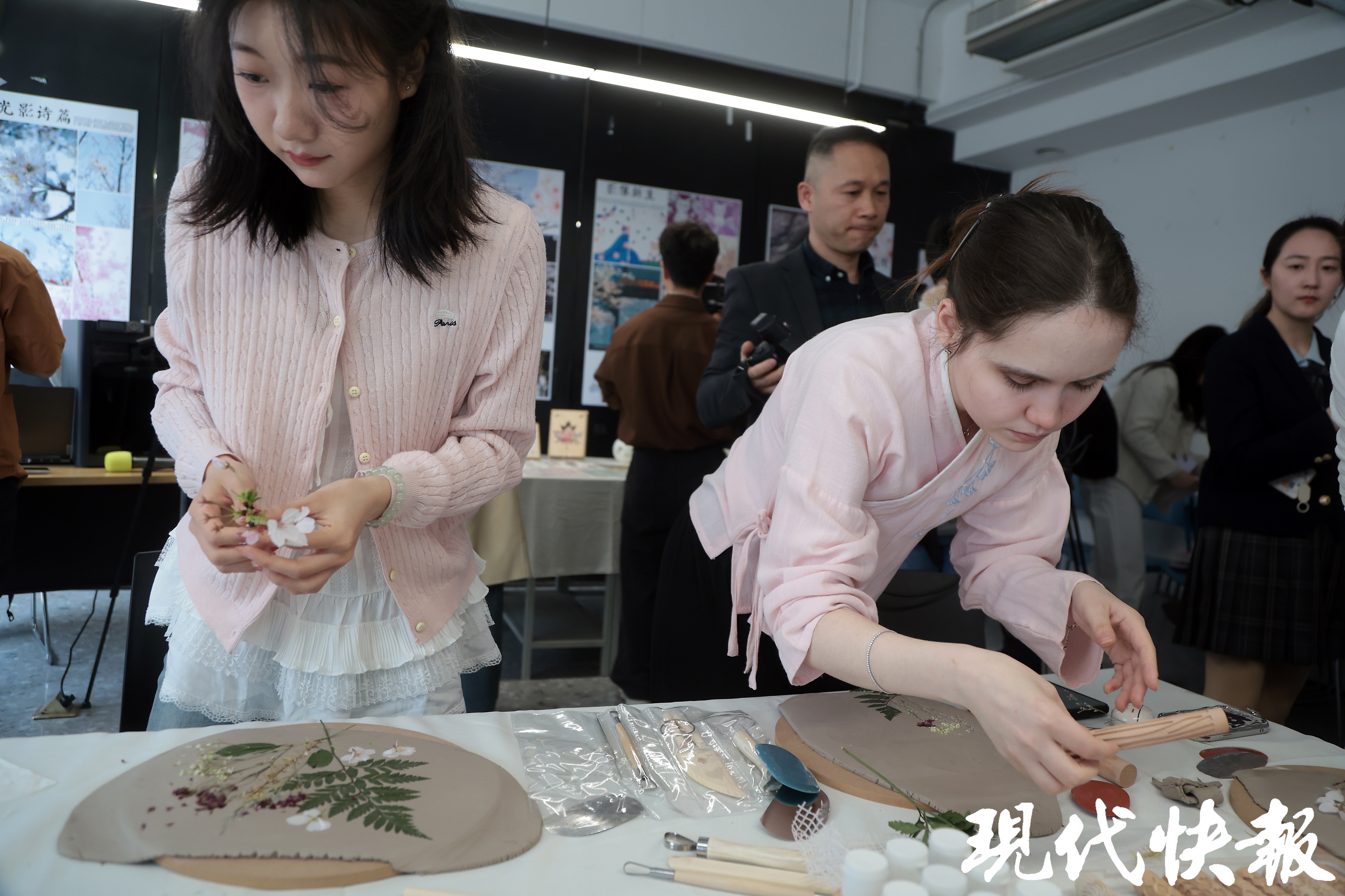 窗外,粉红的樱花怒放在枝头;窗内,斑斓的花草盛开在手中。3月24日,在樱花盛放的南京,东南大学最美樱花教室“绽放”。东大师生以樱花为主题,现场体验陶艺,将从校园里捡拾的花花草草,拓印到了瓷盘上,再给纹样着色,中式浪漫圈粉了一大批外国留学生体验。更别致的是,同学们利用3D打印、AI等前沿技术自制文创产品。