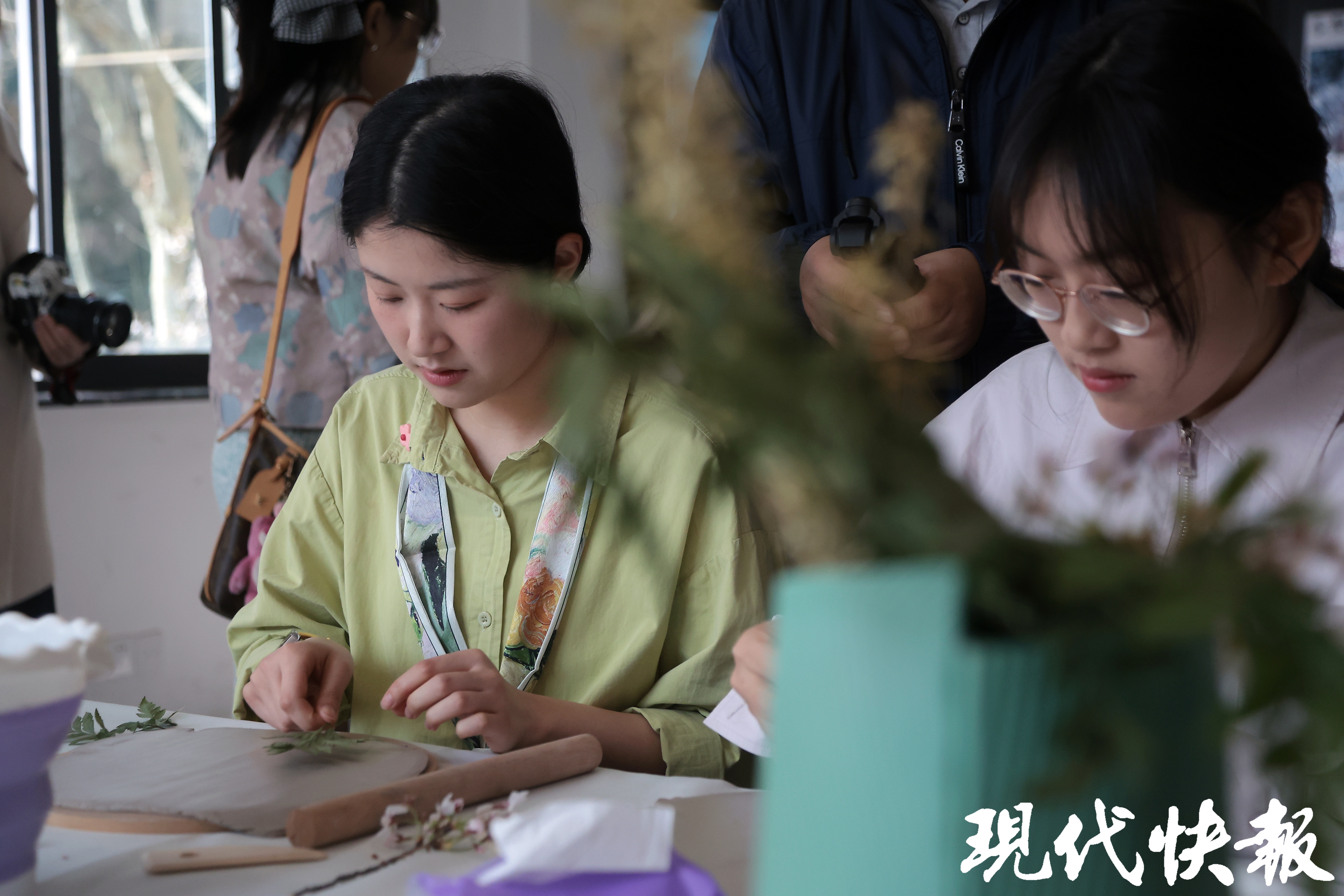 樱花教室内,东南大学建筑学院教师兰祥启正带领同学们体验陶艺,感知植物形态,体验自然之美。这次课程融入了AI的元素。