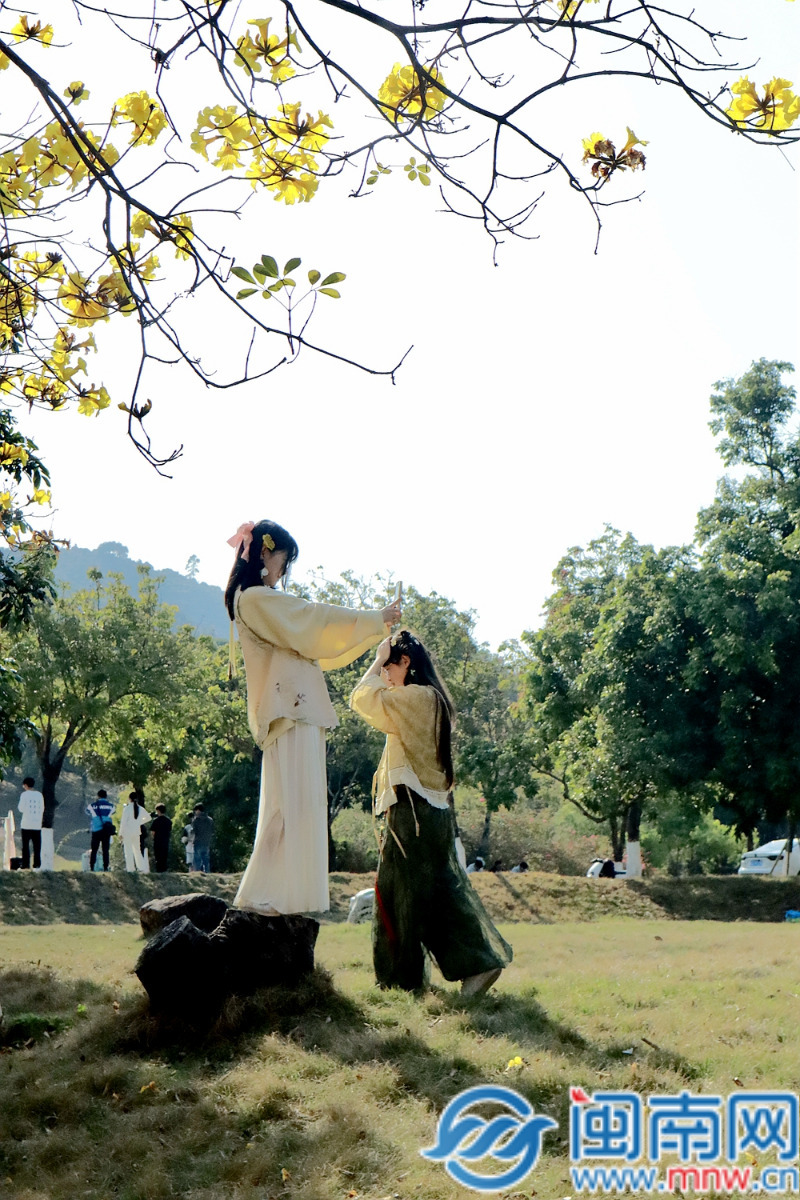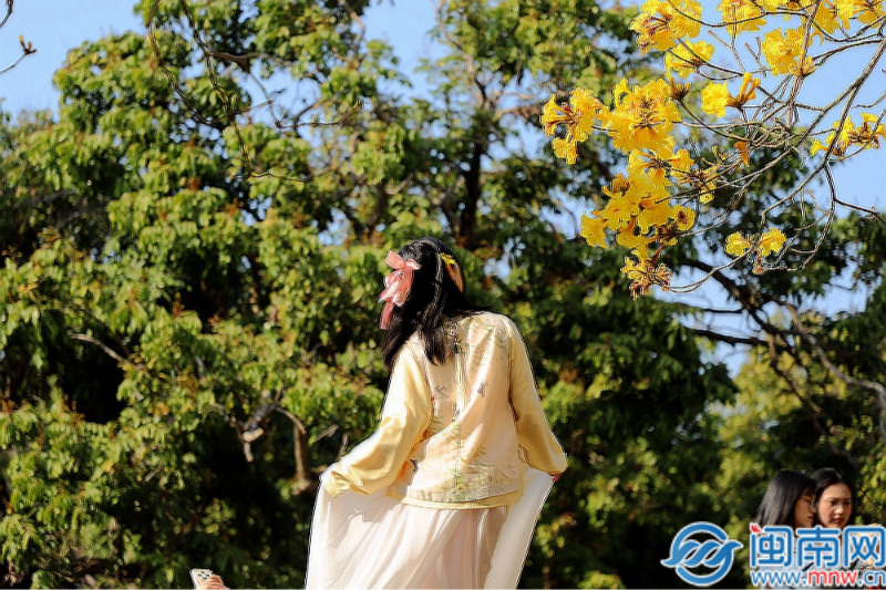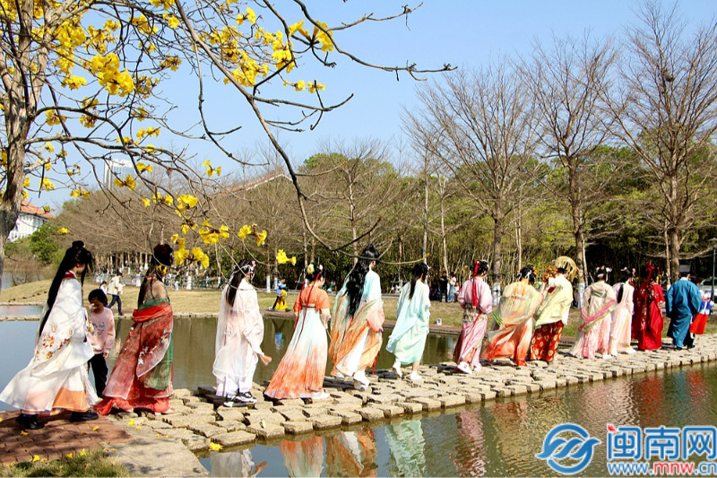 闽南网3月25日讯(通讯员嘉闻闽南网记者周怡楠文/图)芳华不负嘉庚志,且以百花寄春声。近日,厦门大学嘉庚学院在校园里的湖心岛举办“我们的节日·花朝”活动。赏花、投壶、猜字谜、社团展示……现场,人潮涌动。岛上的黄花风铃木林正值盛放期,金色花海下,师生们共赴春日之约。