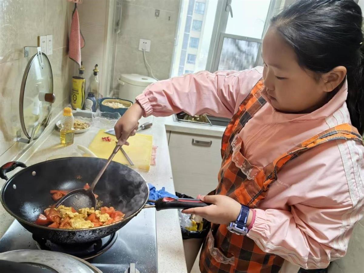 活动首日,学生们将课堂延伸至家庭厨房。三年级学生蒸出滑嫩的鸡蛋羹,四年级调配清爽的凉拌黄瓜,高年级则挑战番茄炒蛋与排骨藕汤。四年级学生韩云飞在灶台前忙得不亦乐乎:“当家人品尝我做的菜时,我感到非常自豪和满足。这次活动让我意识到劳动不仅能带来快乐,还能增进家庭成员之间的感情。”