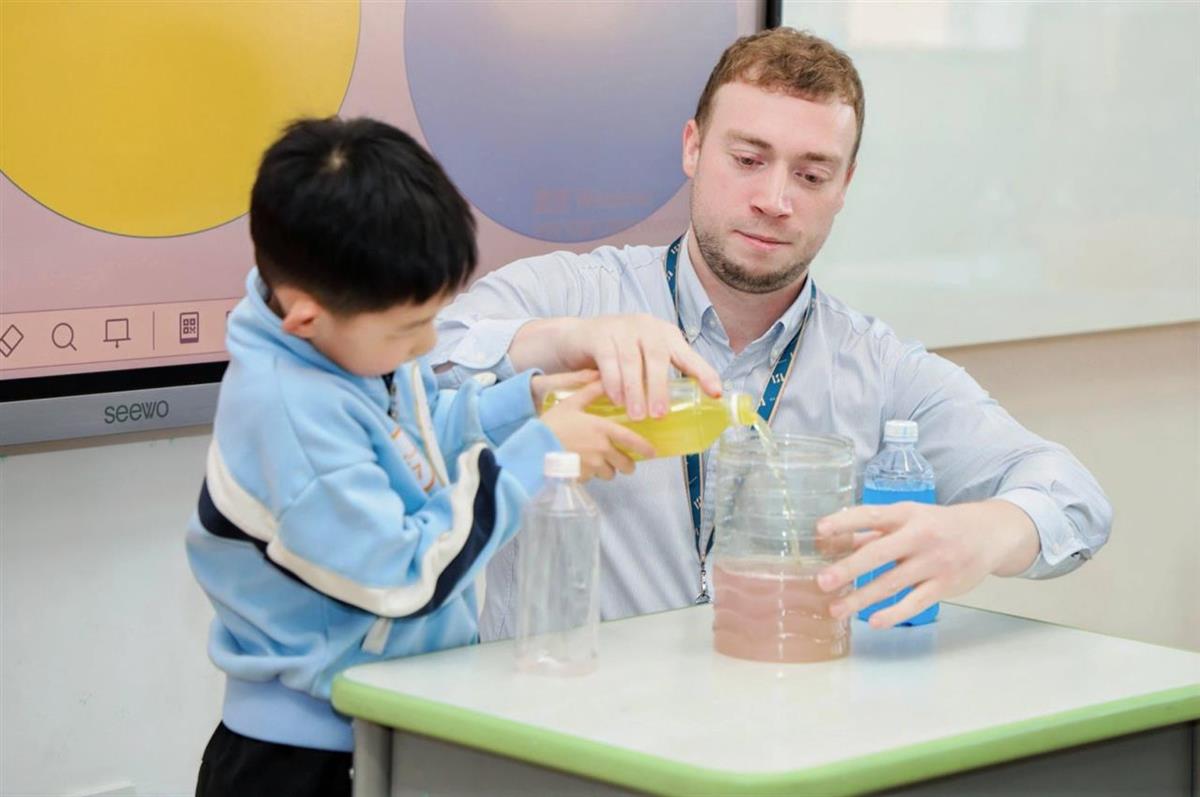 随后,Daniel神秘地拿出一瓶透明液体,邀请孩子们轮流摇晃。“Shake it !”随着清澈的水渐渐变成了鲜艳的红色,教室里爆发出阵阵惊叹。接着,Daniel将红色和黄色液体混合,询问孩子们它会变成什么颜色,随着橙色液体的显现,孩子们齐声欢呼:“Orange!”通过4组颜色混合实验,20名孩子在30分钟内不仅掌握了10个颜色词汇,还学会了“mix”“shake”“make”等动词。
