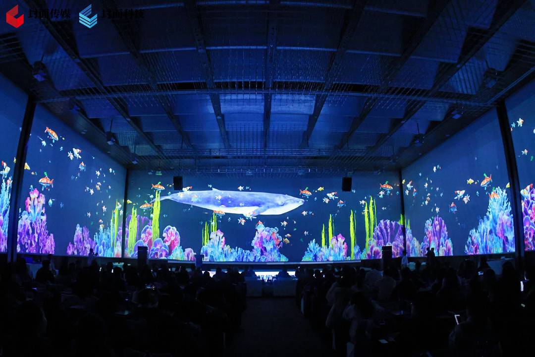 这是一场科技与艺术深度融合的品牌盛宴。活动开启,由封面科技打造的虚拟鲸鱼在XR全息投影的幽蓝光幕中缓缓游出,现场嘉宾的目光随其尾迹,一同沉浸于2025超级品牌节的深蓝之境。