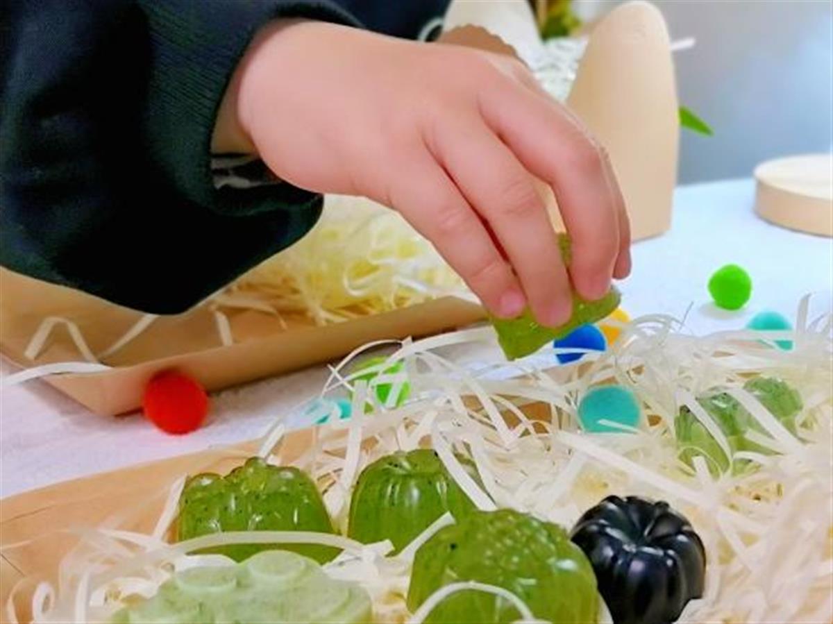 融化皂基环节,操作台变身“微型实验室”。张暄和紧盯电磁炉上的锅,突然扯了扯老师衣角:“肥皂在咕嘟咕嘟打喷嚏,要不要喂它喝水?”正用木棒搅拌皂基的王嘉乐说,“这是皂基在跳融化舞呢,等它们变成亮晶晶的‘果冻’就能和艾草做朋友啦!”艾草处理、皂基融化、混合调配、入模定型……在等待皂液凝固的二十分钟里,柯子钰托腮凝望樱花模具,突然转头问小伙伴:“肥皂宝宝会不会怕冷呀?”正在用艾草叶装饰模具的王嘉乐闻言,立即扯下自己外套上的毛绒贴纸盖在模具上:“我的小熊衣服分给你穿!”这暖心举动引发连锁反应,孩子们或用树叶当被子,或哼唱儿歌安抚“肥皂宝宝”。