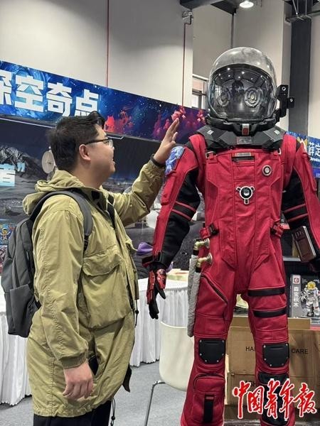 3月28日,中国科幻大会北京科幻嘉年华展区,《流浪地球》中的宇航服吸引了很多人的目光。中青报・中青网见习记者 崔文瀚/摄