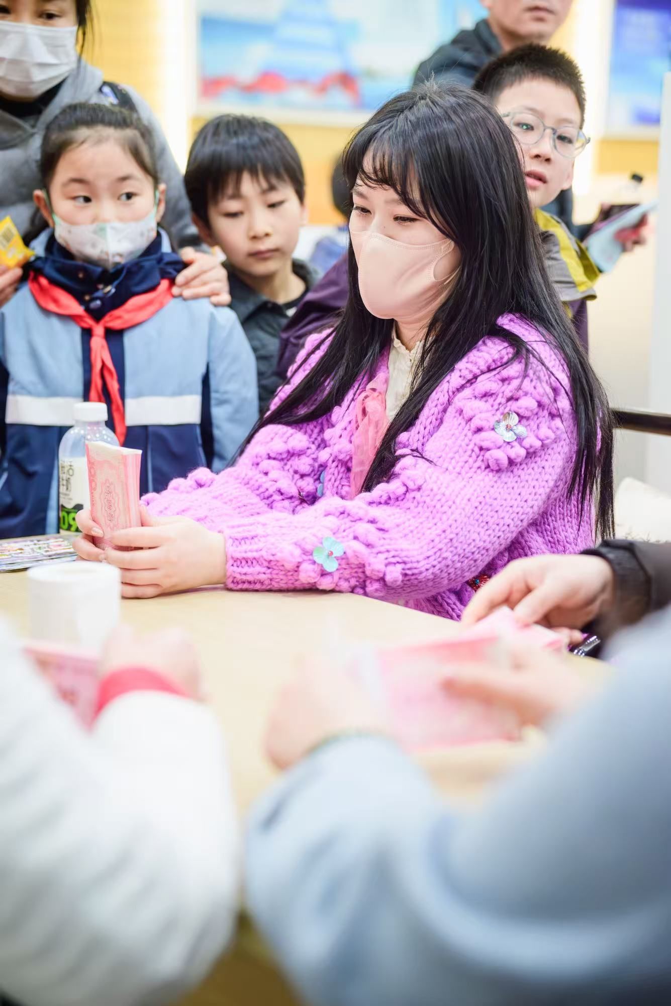 转入营业大厅后,孩子们在现金柜台前化身“小小柜员”。银行专员示范的专业点钞手法引发阵阵掌声,在随后的点钞比赛中,同学分6个小组以清点不同数量练功券展开了PK赛。“手指要像弹簧一样灵活!”获奖小朋友现场分享的秘诀引得大家跃跃欲试。