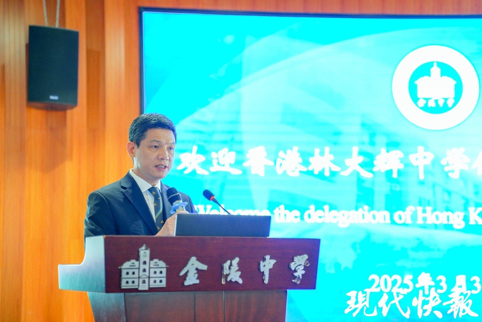 欢迎仪式上,林大辉中学校长郭剑辉表示,“在百花盛开的春天,踏进金陵中学的校园,让我感受到生命的蓬勃与活力。金陵中学在137年办学历程中,恪守‘诚、真、勤、仁’校训,培养出六万多名优秀人才,是优秀教育的典范。林大辉中学2004年创校,是一所年轻的中学。两校培养优秀学生的目标是相同的。”郭剑辉说:“此次交流活动中,我们的学生将参加各种丰富多彩的学习和文化活动,教师也有专业的交流机会,我们非常珍惜与金陵中学建立的友谊,这不仅是一段美好的回忆,更是一个携手共进的机会。我们希望通过未来的交流活动,相互学习,共同成长。希望这次的经历能激发学生的学习热情,继续追寻知识的脚步,透过参观与交流,联系苏港两地情谊,认识国家文化,历史和成就,将来做一个有家国情怀的人,贡献社会和国家。”