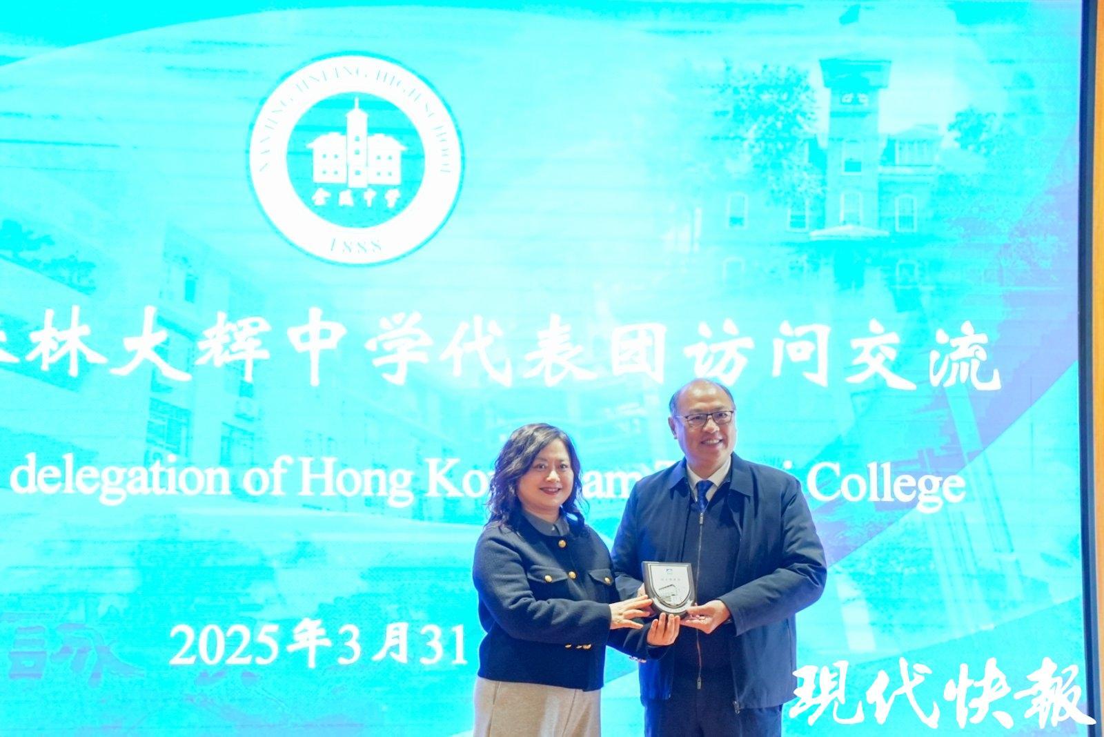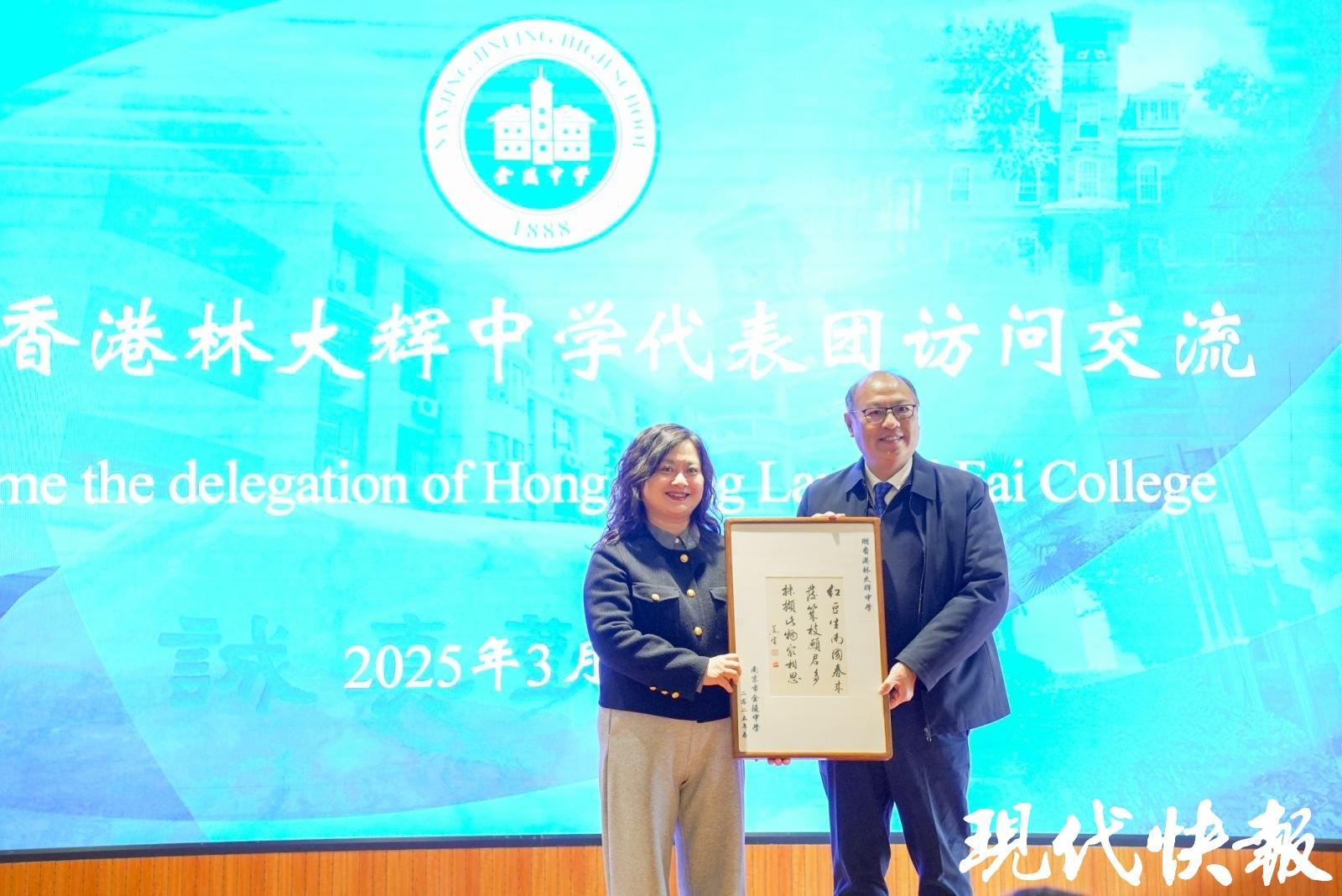 南京市金陵中学党委书记孙小红在致辞中表示,“去年三月春满江南时,两校在金陵缔结金兰之谊。林大辉学子在金中校园留下的青春足迹,在STEAM实验室激荡的创新火花,在非遗工坊体验的文化传承,都成为我们共同的珍贵记忆。当得知贵校即将再度来访的消息时,学校高二年级志愿者报名极其踊跃,这份超越时空的赤子热忱,正是两校教育理念同频共振的最好见证。今天的重逢,既是对过往情谊的深情回望,更是面向未来的崭新启航。金陵中学将始终以最开放的胸襟、最真诚的态度,与林大辉中学共享优质教育资源,在课程共建、师资共培、学生共育等方面深化合作,让香江之畔的创新活力与金陵文脉的厚重底蕴交相辉映。此刻站在长江与香江的交汇点上,让我们共同许下教育者的庄严承诺:以共情共享浇筑成长沃土,用同根同心培育时代栋梁。”