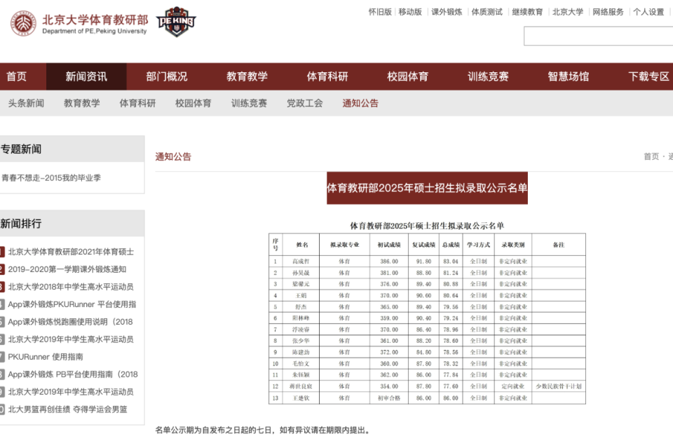 ▲北京大学体育教研部2025年硕士招生拟录取公示名单