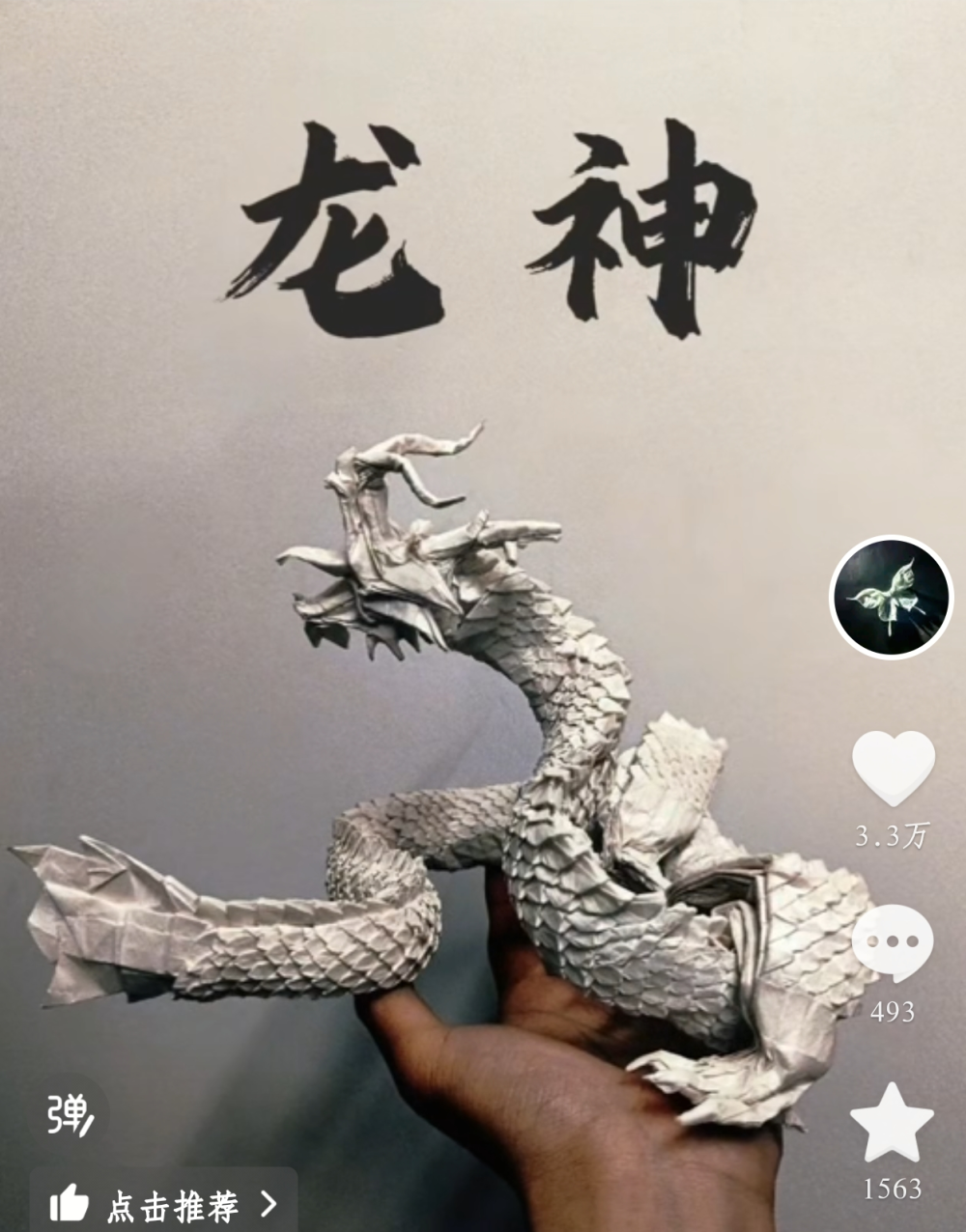 最近,万山河又完成了一个“大工程”,他复刻了折纸大师神谷哲史创作的,被称为世界上最复杂的折纸作品之一的“龙神”。在社交平台上,这条视频的点赞量已超3万。