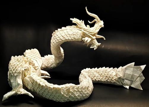 “龙神”是折纸圈公认的世界级难度的折纸作品,从造型上看,“龙神”就是一条盘踞的龙,但细节很精致,密集的鳞片、头身的衔接……