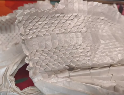 因为纸张很大,折线间距很小容易散开,万山河在开始聚合的时候用上了胶带和长尾夹辅助,固定后再取下,“聚合成基本型就花了12天左右,在家里睡醒了就折,折累了就休息。”