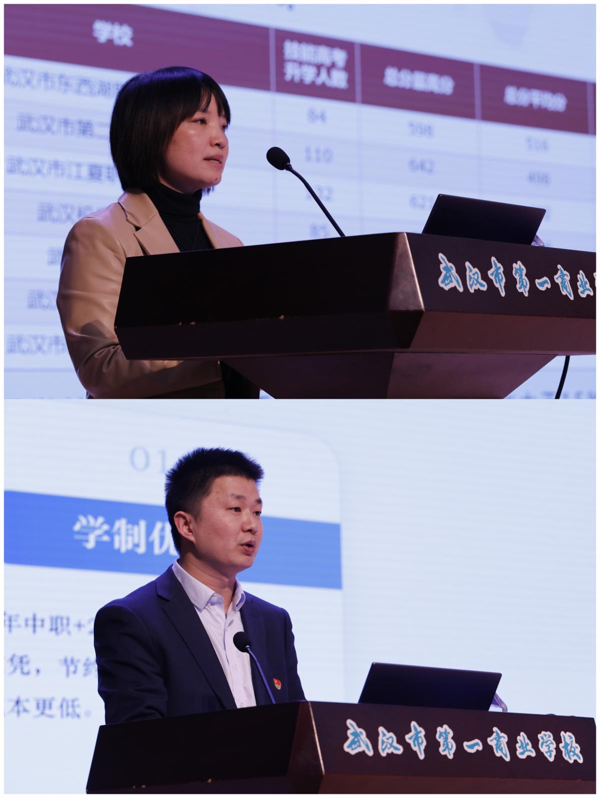 会上,市教科院研究员冯辉、市第一商业学校教务处主任杨孝刘分别汇报了2024年职教高考质量分析及“3+2”贯通培养质量分析。