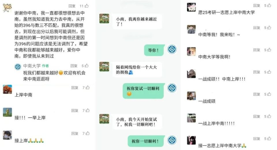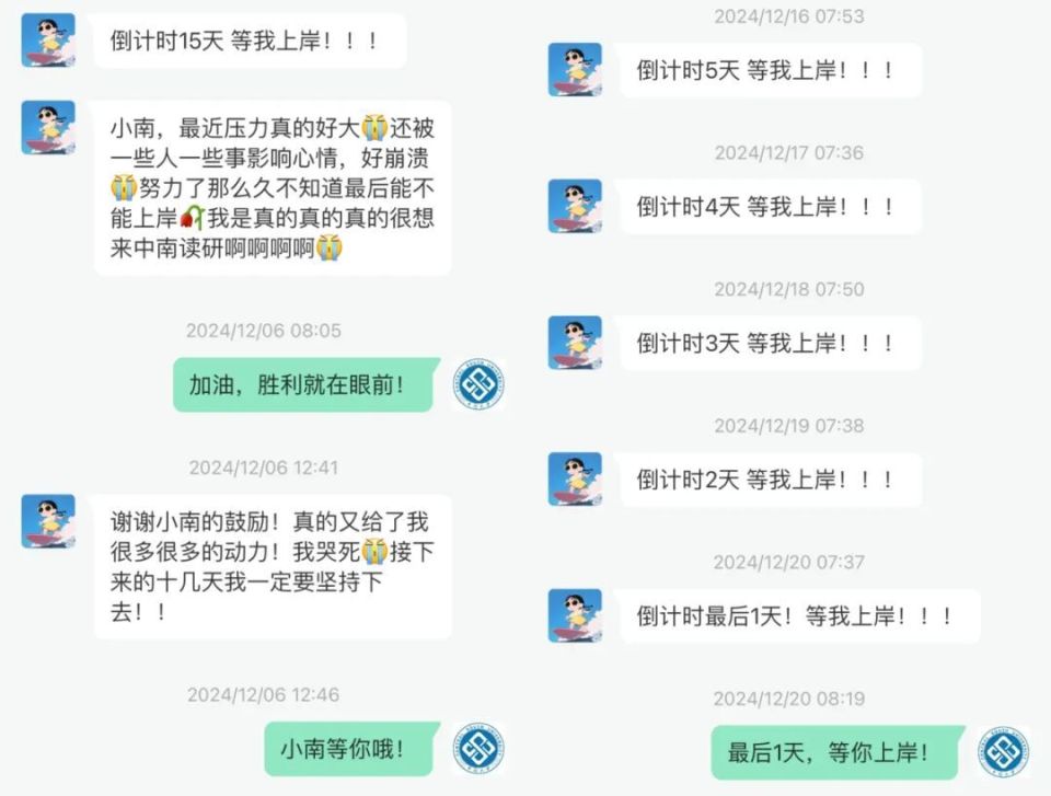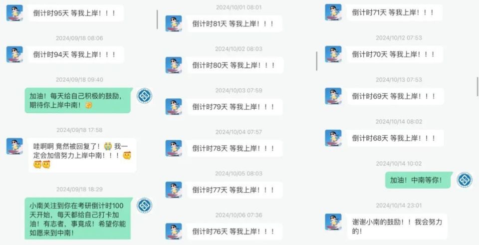 在考研最后的100天里,有位女孩每天早上七八点都会在中南大学官微后台留言同样一句话:“倒计时XX天,等我上岸!”