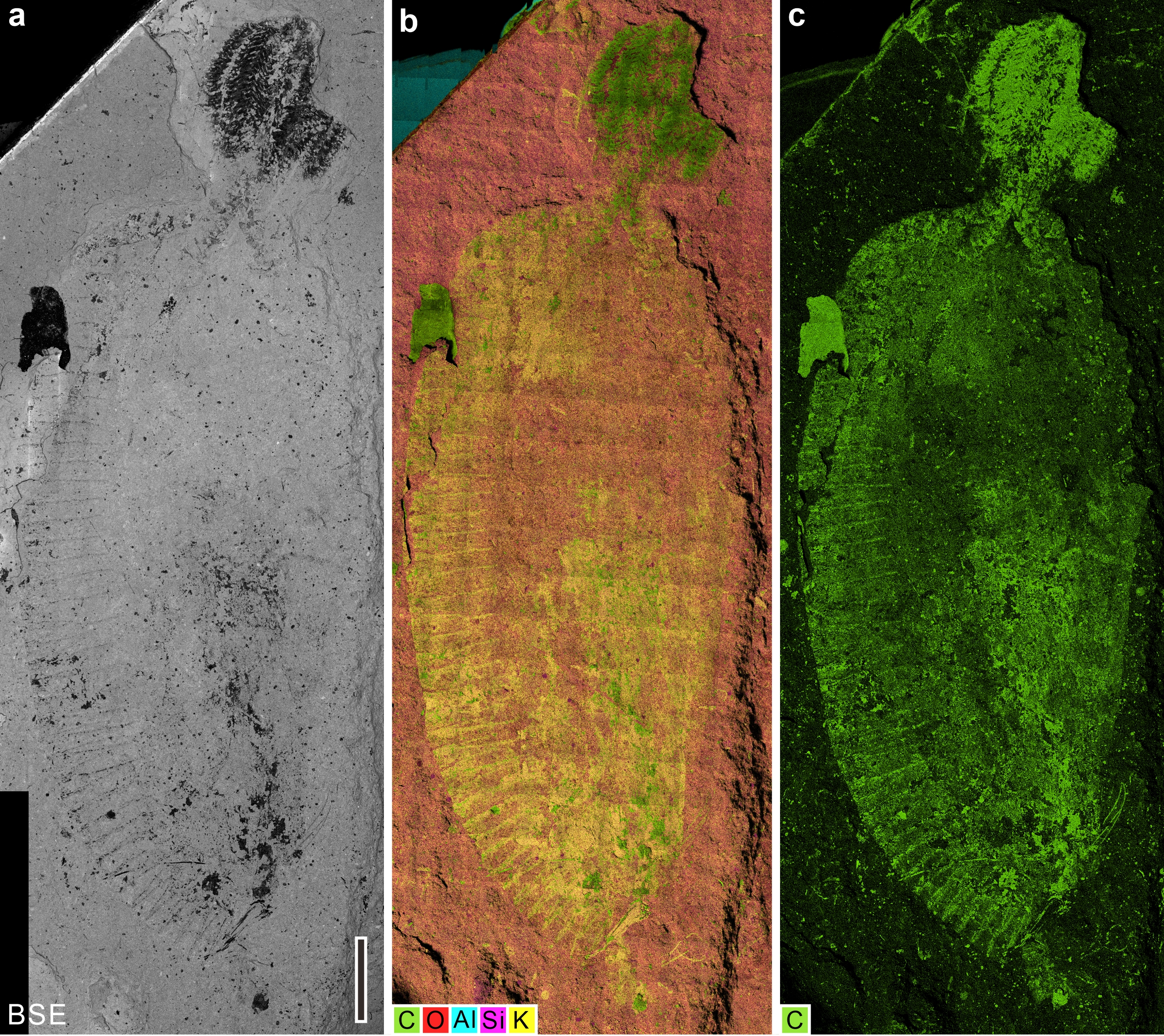 侏罗虫的扫描电镜(a)、多元素能谱(b)和碳元素能谱(c)照片