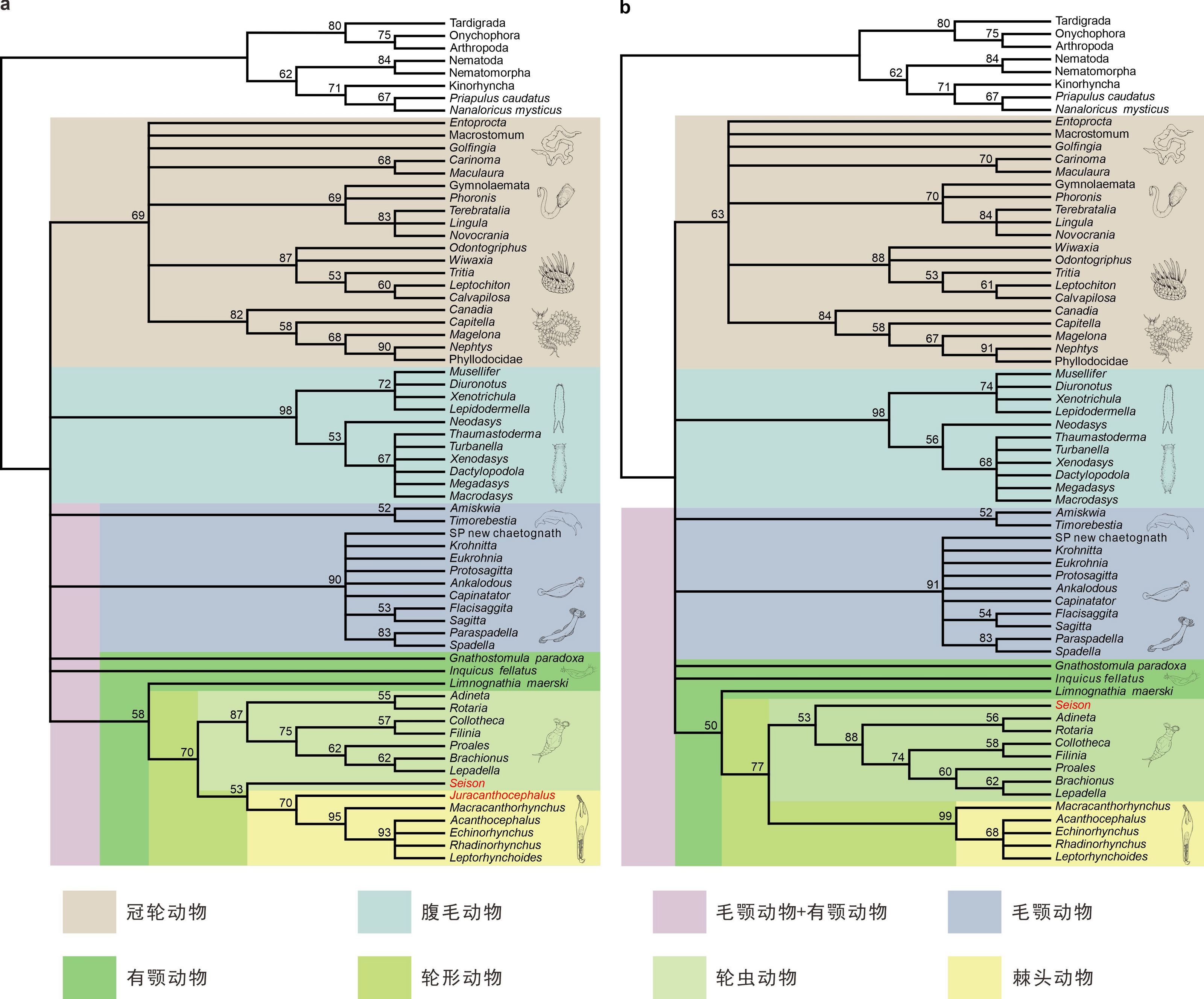 利用最大简约法分析得出的部分蠕虫类系统发育结果。当形态数据矩阵中包含了侏罗虫时,侏罗虫是尾盘纲轮虫向棘头虫演化的过渡类群(a图);在不包含侏罗虫时,尾盘纲轮虫成为其他轮虫的姊妹群(b图)